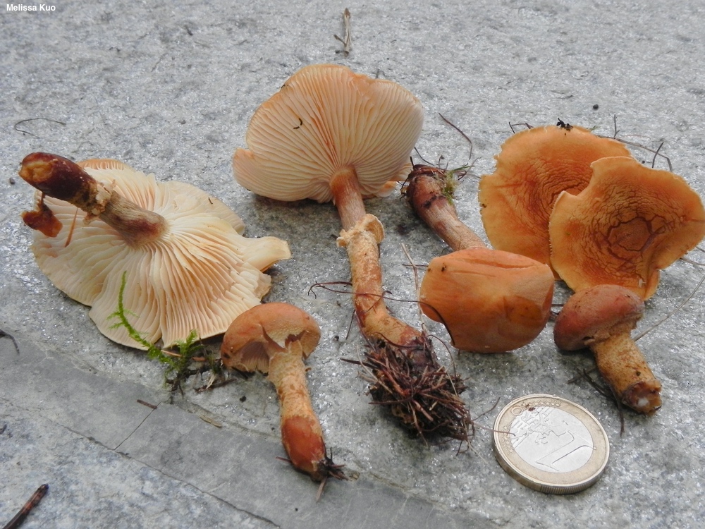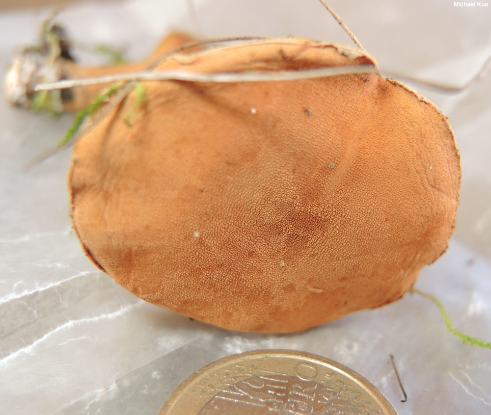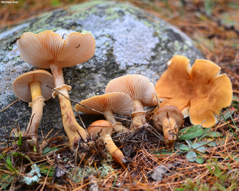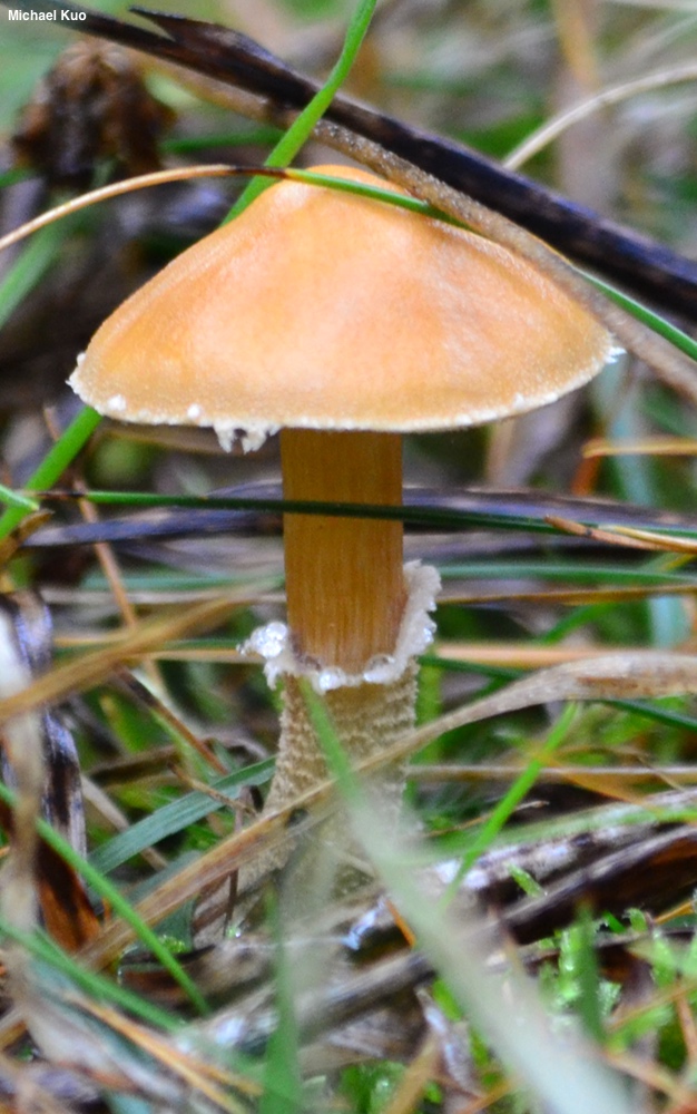 [Basidiomycota > Agaricales > Squamanitaceae > Cystoderma . . . ] Cystoderma carcharias by Michael Kuo, 20 December 2025 Also known as Cystoderma fallax, Cystoderma carcharias features a persistent, flaring ring on its stem, like a sheath that has been folded back at the top. The species is found in conifer woods in North America and Europe, primarily in northern and montane regions. Like other cystodermas it features a white spore print and gills that are attached to the stem. Since Cystoderma carcharias is often a northern species, boreal and near-boreal collections should be compared with Cystoderma tuomikoskii, also known as Cystoderma arcticum, which is very similar but limited to boreal areas; arcticum is best separated by its larger spores, which are 5–10 µm long. Description: Ecology: Saprobic; growing alone, scattered, or gregariously, under conifers; late summer and fall (over winter in California); originally described from Europe (Persoon 1797), with an epitype designated from Sweden (Saar et al. 2009); widely distributed in Europe; widely distributed in North America, primarily in northern and montane areas. The illustrated and described collections are from Italy and Colorado. Cap: 2–6 cm; convex at first, becoming broadly convex or nearly flat; dry; finely bumpy-granular or fairly bald; the margin adorned with granular veil tatters; yellow-orange, becoming brownish orange or orangish brown; the margin not lined. Gills: Narrowly attached to the stem; close; short-gills frequent; creamy whitish to pale orangish. Stem: 3–9 cm long; 4–10 mm thick; more or less equal; dry; pale and fairly smooth near the apex, but sheathed below with a felty, granular veil, with the sheath terminating in a prominent, folded-back ring with a white upper edge; orange to brownish; basal mycelium white. Flesh: Whitish; unchanging when sliced. Odor: Not distinctive. Spore Print: White. Microscopic Features: Spores 3–6 x 2.5–3.5 µm; ellipsoid to sublacrymoid; smooth; weakly amyloid, or inamyloid; hyaline in KOH. Basidia 26–28 x 4–5 µm; clavate; 4-sterigmate. Hymenial cystidia not found. Pileipellis a trichoderm of chained, subglobose to pyriform, smooth elements 15–40 µm wide, with orangish brown walls in KOH. REFERENCES: (C. H. Persoon, 1797) A. H. Smith & R. Singer, 1945. (Smith & Singer, 1945; Smith & Singer, 1948; Smith, 1949; Smith, 1975; Smith, Smith & Weber, 1979; Arora, 1986; Phillips, 1991/2005; Schalkwijk-Barendsen, 1991; Lincoff, 1992; Breitenbach & Kränzlin, 1995; Saar, 2003; McNeil, 2006; Boccardo et al., 2008; Laursen & Sepelt, 2009; Saar et al., 2009; Trudell & Ammirati, 2009; Buczacki et al., 2012; Saar, 2012; Desjardin, Wood & Stevens, 2015; Evenson, 2015; Siegel & Schwarz, 2016; Gminder & Böhning, 2017; Læssøe & Petersen, 2019; Kibby, 2020; MacKinnon & Luther, 2021.) Herb. Kuo 10141412, 09221805. This site contains no information about the edibility or toxicity of mushrooms. |