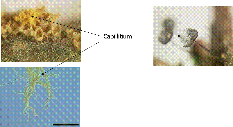 ( plural capillitia): A system of sterile elements found within the spore mass of many myxomycetes.