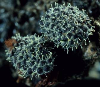 Sporangia of Metatrichia vesparium with the myxomyceticolous hyphomycete Polycephalomyces tomentosus