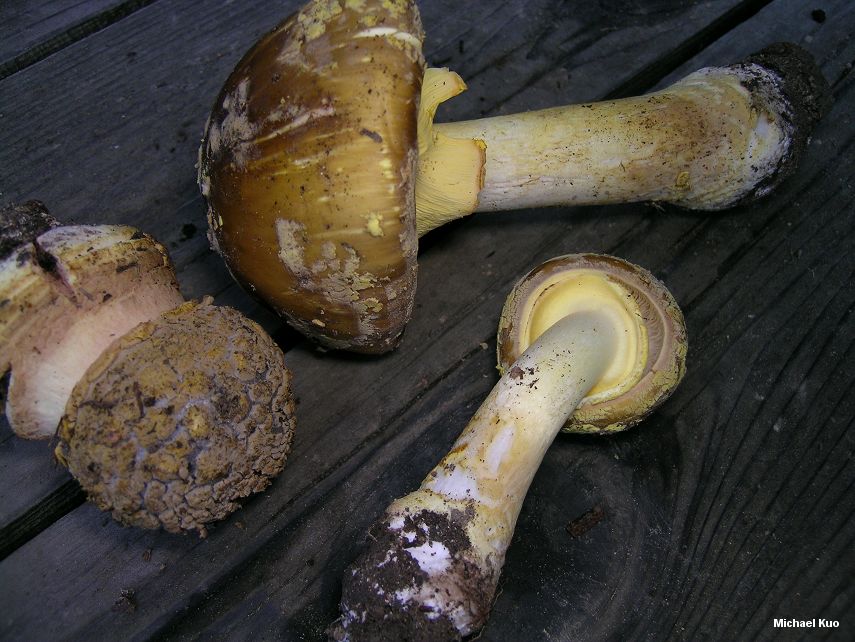 Amanita augusta [ Basidiomycetes > Agaricales > Amanitaceae > Amanita . . . ] by Michael Kuo Amanita augusta is a recently named West-Coast species with a gorgeous brown cap that features yellow warts. The base of the stem features flaky yellow patches of universal veil material, and the upper stem displays a pale yellow ring. The species is fond of conifers, although it is sometimes reported under live oaks. Amanita augusta was previously misidentified as the European species Amanita franchetii. For a somewhat similar species in eastern North America, see Amanita species 06. Thanks to University of California Herbarium for facilitating my study of the collection cited below. Description: Ecology: Mycorrhizal with conifers (especially Bishop pine and Douglas-fir), and sometimes reported under coast live oak; usually growing alone or scattered; fall and winter; northern California to Alaska. Cap: 4-15 cm; convex, becoming broadly convex or flat; dry; brown to yellow-brown, often with a paler marginal area (in wet conditions sometimes becoming yellow overall); adorned with yellow to yellowish warts or patches that are sometimes lost by maturity; the margin not lined. Gills: Free from the stem by maturity; crowded; whitish or pale yellowish; short-gills frequent. Stem: 4-15 cm long; 1-3 cm thick; tapering to apex and ending in a swollen bulb; bald or scurfy; yellow, fading to whitish; with a skirtlike, yellow, lined ring; base with concentric yellow girdles of universal veil material when very young, but soon with indistinct flakes and patches of yellow veil material. Flesh: Whitish to pale yellow; not discoloring on exposure. Spore Print: White. Microscopic Features: Spores 7-10 x 4.5-6.5 µ; smooth; ellipsoid; amyloid. Pileipellis an ixocutis of elements 2-7 µ wide. Basidia 4-spored; without clamps. Lamellar trama bilateral; subhymenium with inflated cells. REFERENCES: Bojantchev & R. M. Davis, 2013. (Thiers, 1982; Arora, 1986; Jenkins, 1986; Phillips, 1991/2005; Lincoff, 1992; Miller & Miller, 2006; Trudell & Ammirati, 2009 [all as franchetii].) Herb. Kuo 01120613; Herb. UC 1999354 (TD Bruns PtR 822). This site contains no information about the edibility or toxicity of mushrooms. |