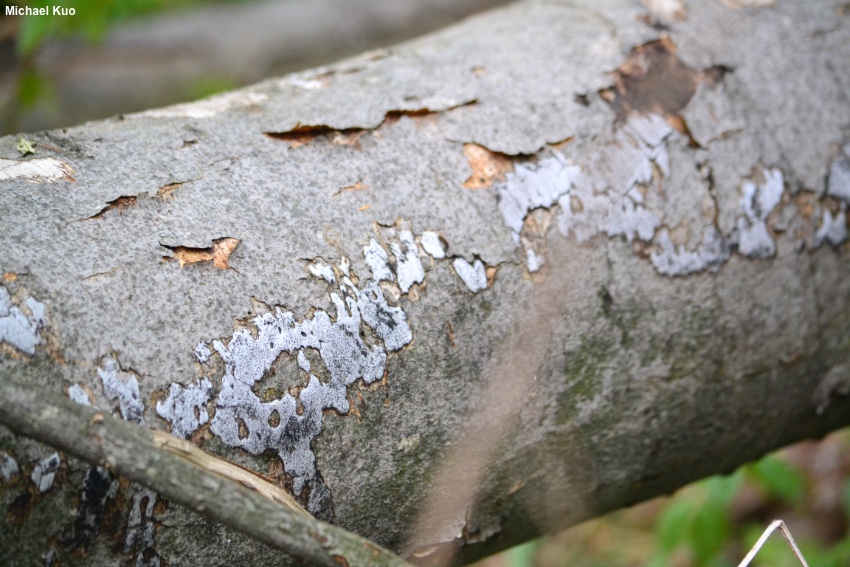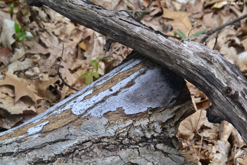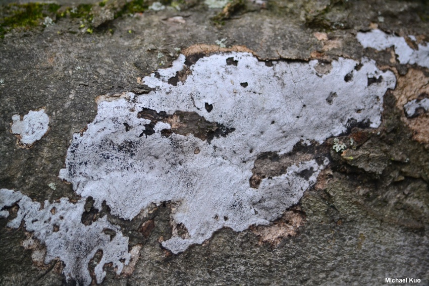 Biscogniauxia atropunctata [ Ascomycota > Sordariomycetes > Xylariales > Biscogniauxia . . . ] by Michael Kuo Appearing in spring and early summer in oak-based forests east of the Rocky Mountains, this subtly beautiful crust fungus spreads across standing and fallen logs in bluish gray patches. The surface of the fungus is hard and, from a distance, appears smooth—but on close examination is punctuated with many tiny, pimply black dots. At maturity Biscogniauxia atropunctata is more white than gray, and has lost its bluish shades. Eventually, the patches become blackened. Hypoxylon atropunctatum is a synonym. Description: Ecology: Saprobic on the deadwood of oaks and other hardwoods; causing a white rot; probably widely distributed east of the Rocky Mountains. The illustrated and described collections are from Illinois. Fruiting Body: Spreading in resupinate patches ranging from a few cm across to quite large (nearly a meter), irregular in outline; surface bluish gray to purplish gray when fresh and young, maturing to nearly white, covered with tiny black dots; eventually becoming blackened overall; less than 1 mm thick; flesh black and very tough. Odor: Not distinctive. Microscopic Features: Spores 24–32 x 12–15 µm; fusiform to sublimoniform or subellipsoid; with a single longitudinal germ slit extending the length of the spore; smooth; very dark brown to black in KOH. Asci cylindric; with amyloid tips. REFERENCES: (Schweinitz, 1822) Pouzar, 1979. (Ju & Rogers, 2001; Vasilyeva et al., 2007; Binion et al., 2008; Beug et al., 2014; Woehrel & Light, 2017.) Herb. Kuo 04261401. This site contains no information about the edibility or toxicity of mushrooms. |
