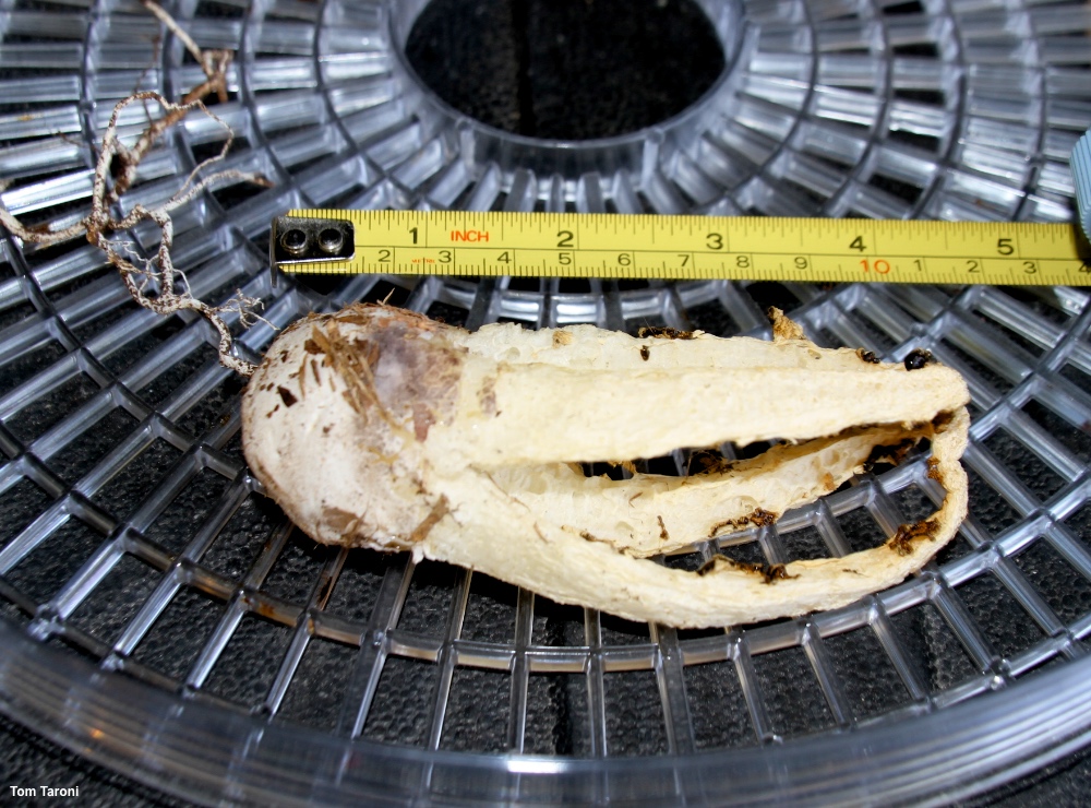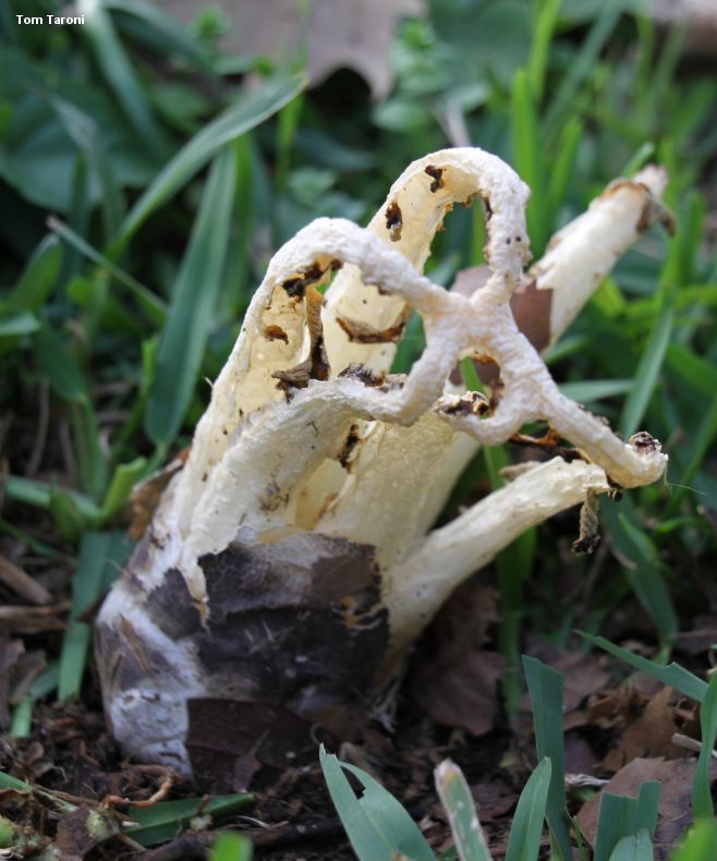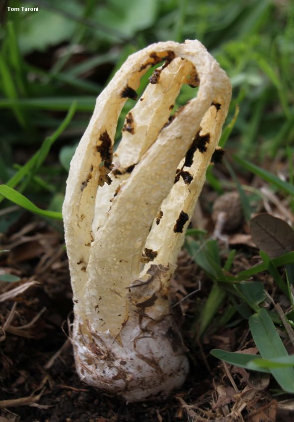 Blumenavia rhacodes [ Agaricomycetes > Phallales > Clathraceae > Blumenavia . . . ] by Michael Kuo Originally described from Brazil, this interesting stinkhorn began to be documented in the Houston, Texas area in the early nineties; it may have been introduced through Houston shipping from South America. On casual inspection it looks like a white version of Clathrus columnatus, but its spore slime is produced on conspicuous membranous "glebifers" that are attached to the inner surfaces of the arms. There are, believe it or not, several similar-looking mushrooms—but none of them is typically as quite as large as Blumenavia rhacodes. Tanzania's Blumenavia usambarensis has white arms with glebifers only on the upper half of each arm, and smaller spores; Mexico's Blumenavia heroica and Blumenavia toribiotalpaensis feature grooved arms—the former with arms of even width and the latter with arms that narrow to the apex. Brazil's Blumenavia baturitensis has funky, finger-like glebifers and arms that narrow to the apex, while Blumenavia crucis-hellenicae, also from Brazil, has delicate, thin arms and a cross-shaped glebifer suspended from the apex of the structure. And now we arrive at "Blumenavia angolensis," which is a name frequently encountered in field guides and stinkhorn literature. Despite widespread use of its name, the species itself is poorly understood and has not been adequately defined in a contemporary treatment (see the linked page if you feel this statement needs justification). If Blumenavia angolensis is a useable name, it refers to a small and graceful, pure white species from Angola with glebifers only near the top and an odor of fermented grapes; its distribution is uncertain. Thanks to Tom Taroni for collecting, documenting, and preserving Blumenavia rhacodes for study; his collection is deposited in The Herbarium of Michael Kuo. Description: Ecology: Saprobic; growing alone or gregariously--often near stumps or woody debris; originally described from Brazil; distributed, at a minimum, from Brazil through Mexico and into Texas, but precise distribution limits are uncertain due to confusion with other species. The illustrated and described collection is from Texas. Fruiting Body: When young appearing like a whitish to brown or black "egg," but soon "hatching" and developing into a cage-like structure measuring up to 13 cm high and 5 cm wide; oval in shape, composed of 3–5 unbranched, pale yellow to creamy whitish arms that are joined at the top; arms about 1–1.5 cm wide, in cross-section more or less triangular or four-sided, with the outer surface fairly flat (but lacking a pronounced longitudinal groove) and the inner surfaces more rough, punctuated by membranous flaps of tissue ("glebifers"); the edges between outer and inner surfaces often appearing jagged or "toothed"; spore slime dark brown, produced on the glebifers on the inner surfaces of the arms, from the top of each arm nearly to the bottom; bases of arms free, but encased in a whitish to dark gray, dark brown, or nearly black volva; base attached to prominent white rhizoids. Microscopic Features: Spores 3–4 x 1–1.5 µm; cylindric; smooth; hyaline in KOH; inamyloid. Hyphae of the volva 2–7 µm wide; smooth; hyaline in KOH; with clamp connections. REFERENCES: Möller, 1895. (Lloyd, 1905; Dring, 1980; López et al., 1981; Calonge et al., 2004; Vargas-Rodriguez & Vázquez-García, 2005; López & García, 2012; Trierveiler-Pereira et al., 2014; Melanda et al., 2020.) Herb. Kuo 02211201. This site contains no information about the edibility or toxicity of mushrooms. |