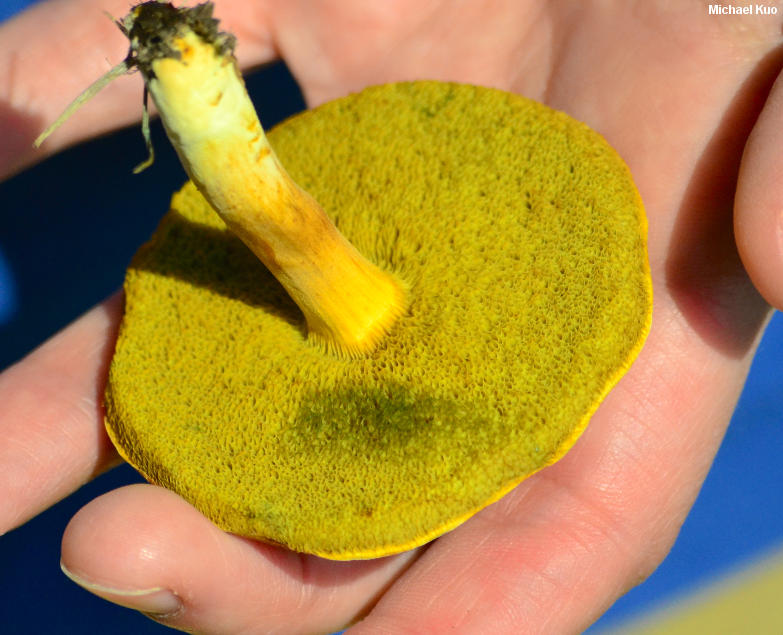 | Boletus subfraternus [ Basidiomycota > Boletales > Boletaceae > Boletus . . . ] by Michael Kuo Boletus subfraternus is the "Malcolm in the Middle" of red-capped, blue-staining boletes; it is a little too large to get confused with Xerocomellus rubellus and similar species--and a little too small to get confused with Boletus bicolor and its associates. Distinguishing features, aside from size, include the pore surface, which develops widely separated slot-like lines near the stem, and which becomes a dark reddish brown in old age; the fact that the cap fades from dark red to brick red and, eventually, to brown; and microscopic features (see below). Using the generic concepts of Šutara (2008), Boletus subfraternus should probably be placed in Xerocomellus. Description: Ecology: Mycorrhizal with hardwoods, including oaks and Tilia species; growing alone, scattered, or gregariously, in woods or at their edges, in grassy areas in parks and gardens; summer; possibly widely distributed east of the Rocky Mountains. The illustrated and described collections are from Illinois. Cap: 4-9 cm; convex, becoming broadly convex or nearly flat in age; dry; finely velvety when very young, but soon bald; dark red at first, becoming brick red; fading to reddish, brown, or tan; the surface not usually becoming prominently cracked at maturity--but the pigments can sometimes become stretched out, creating the appearance of a cracked surface. Pore Surface: Often becoming depressed at the stem and, in age, developing slot-like or gill-like lines near the stem; bright yellow at first, becoming dingy golden yellow and, with old age, reddish brown; bruising promptly blue and then, over time, brown; with 1-2 angular pores per mm; tubes to about 1 cm deep. Stem: 4-9 cm long; 0.5-1.5 cm thick; more or less equal, or very slightly tapered to the base and/or flared at the apex; bright yellow at the apex; pinkish red overall, becoming brownish with age; yellowish basally; bald; dry; bruising blue when handled; not reticulate; basal mycelium bright yellow. Flesh: Pale yellow; staining blue (sometimes faintly) when sliced; reddish to brownish in stem base. Odor and Taste: Not distinctive. Chemical Reactions: Ammonia negative to yellowish on cap surface; negative (but erasing blue) on flesh. KOH dull orange on cap surface; dull orange on flesh. Iron salts negative to gray or bluish gray on cap surface; negative (but erasing blue) on flesh. Spore Print: Olive brown. Microscopic Features: Spores 10-13 x 4-5 µ; subfusiform; smooth; yellow in KOH; brownish to reddish brown in Melzer's. Hymenial cystidia lageniform; to about 40 x 12.5 µ; with granular orangish contents. Pileipellis a collapsing palisadoderm of elements 5-12.5 (-15) µ wide; terminal cells varying from obnapiform to subglobose, or tapered to subfusiform; yellow to orangish-brown in KOH; dark red in Melzer's. REFERENCES: Coker & Beers, 1943. (Smith & Thiers, 1971; Smith, Smith & Weber, 1981; Both, 1993; Bessette, Roody & Bessette, 2000.) Herb. Kuo 06191001, 08101302. This site contains no information about the edibility or toxicity of mushrooms. |