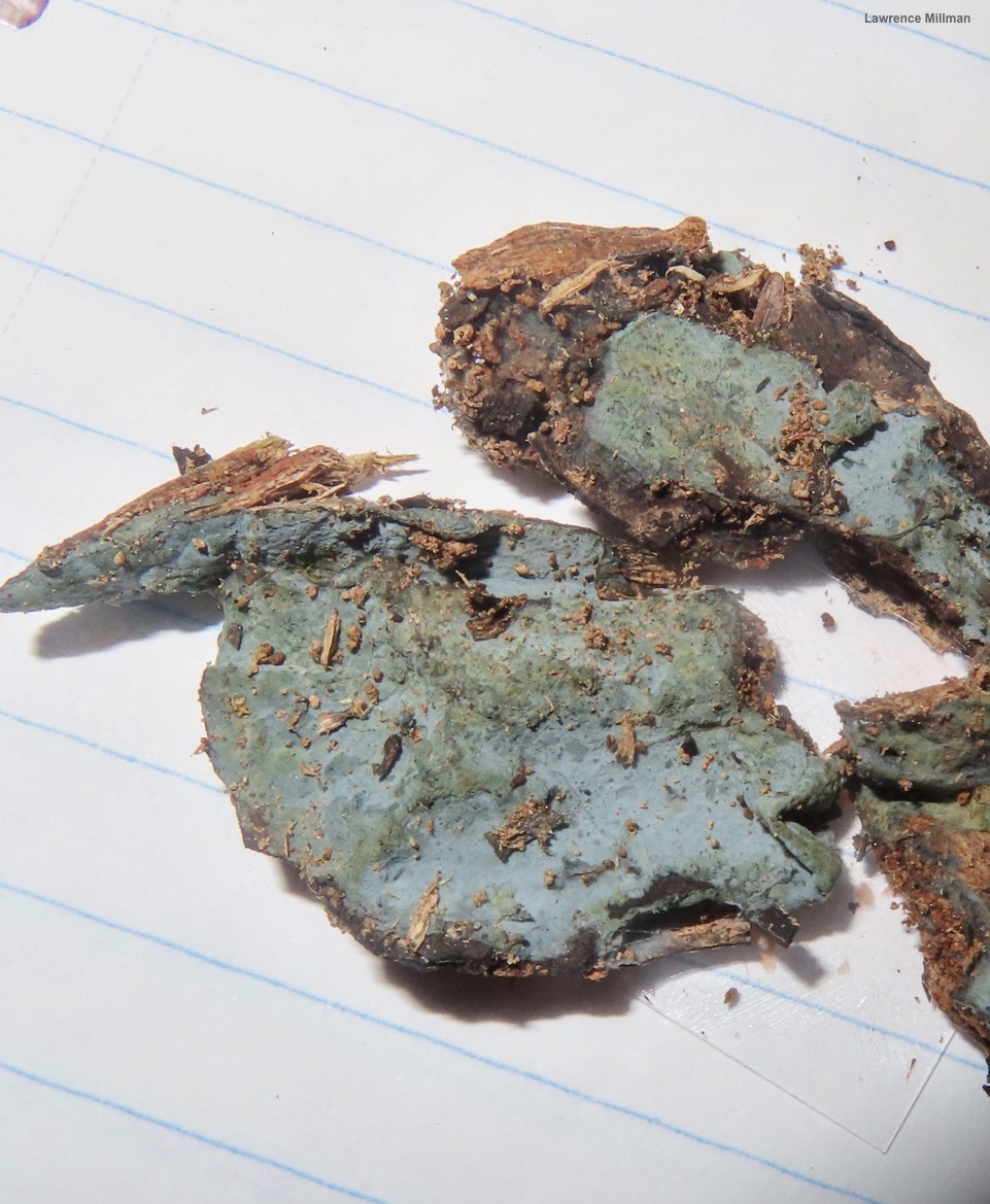 Byssocorticium atrovirens [ Basidiomycota > Atheliales > Byssocorticiaceae > Byssocorticium . . . ] by Michael Kuo Grayish blue, semi-fuzzy, mold-ish-looking patches on deadwood and other forest litter. Byssocorticium atrovirens may challenge your idea of what constitutes a "mushroom," but it is, at least, a fungus large enough to be seen with the naked eye—and, believe it or not, researchers (Tedersoo et al. 2010) believe it may me mycorrhizal. Byssocorticium pulchrum is identical to the naked eye, but features larger spores that measure 4.5–5.5 µm across. To my knowledge, contemporary DNA-based study of the species in the genus Byssocorticium has not been done. Thanks to Lawrence Millman for documenting, collecting, and preserving Byssocorticium atrovirens for study; his collection is deposited in The Herbarium of Michael Kuo. Description: Ecology: Possibly mycorrhizal (Tedersoo et al. 2010 ); growing alone or gregariously on deadwood and forest debris—frequently on the undersides of well-rotted logs; late summer through fall; originally described from Sweden (Fries 1828) and neotypified from Great Britain (Hjortstam 1987); widely distributed in Europe and North America. The illustrated and described collection is from New Hampshire. Fruiting Body: Forming resupinate patches 2–5 cm across; surface finely fuzzy, grayish blue with greenish tints, dry; flesh extremely thin, cottony; edges poorly defined. Microscopic Features: Spores 3–4 µm; subglobose, with an apiculus; smooth; thick-walled; hyaline and often uniguttulate in KOH; inamyloid. Basidia about 20 x 5 µm; clavate; 4-sterigmate. Cystidia not found. Hyphal system monomitic; hyphae 2–4 µm wide, smooth, frequently branched, hyaline to bluish in KOH; clamp connections not found. REFERENCES: (E. M. Fries, 1828) A. S. Bondartsev & R. Singer, 1944. (Eriksson & Ryyvarden, 1973; Tedersoo et al., 2010; Ezhov et al., 2012; Læssøe & Petersen, 2019.) Herb. Kuo 09172301. This site contains no information about the edibility or toxicity of mushrooms. |
