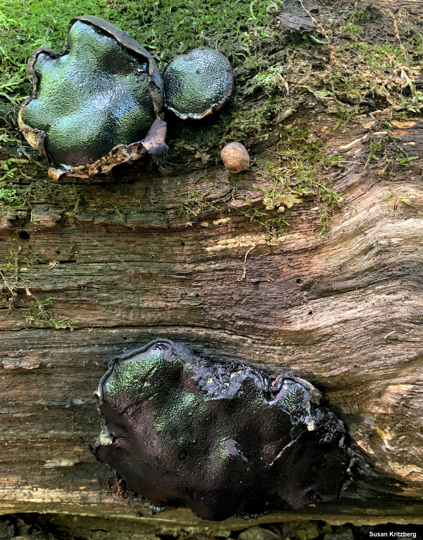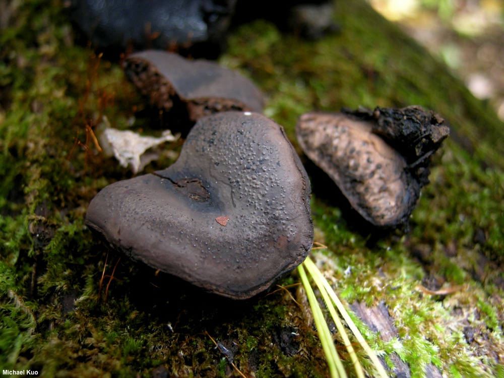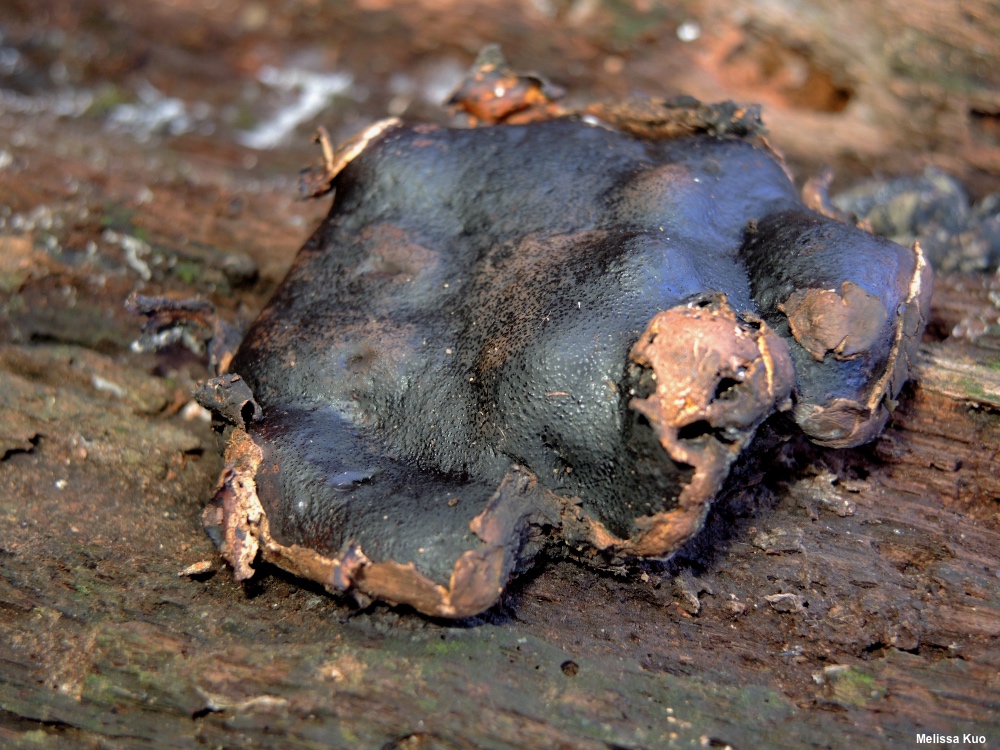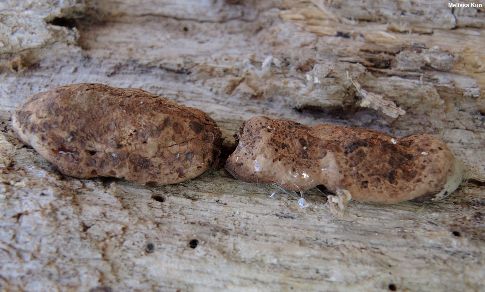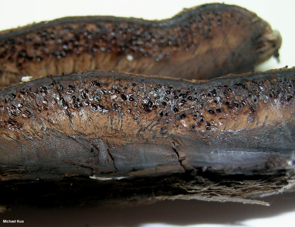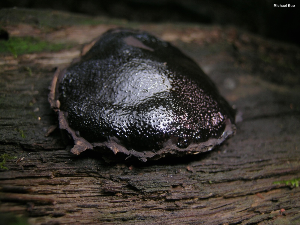 mysterious and spooky. It's altogether ooky . . . Camarops petersii. For more of Uncle Fester's lawn decorations, see Pisolithus tinctorius and Scleroderma polyrhizum. Camarops petersii looks like a bulging black eye, complete with a felty eyelid, stuck to the side of a dead log. The eyelid is a veil that protects the young mushroom but soon ruptures to expose the spore-producing surface. Look for Camarops petersii in the Midwest and the southern Appalachians, on deadwood in hardwood forests. There are several species of Camarops that do not feature the feltlike veil but are otherwise fairly similar in macroscopic appearance, including Camarops polysperma, Camarops ohiensis, Camarops tubulina, and a putative species found on birch logs in the Appalachians (see Vasilyeva et al. 2007). Since the protologue for Camarops petersii makes no mention of the veil (a fact noted as early as Ellis & Everhart, 1892), one wonders whether serious taxonomic study of the genus in North America would shake things up a bit. Thanks to Susan Kritzberg for documenting, collecting, and preserving Camarops petersii for study; her collection is deposited in The Herbarium of Michael Kuo. Description: Ecology: Saprobic on the decorticated deadwood of fallen hardwoods, including oaks and eastern cottonwood; growing alone or in small groups; late summer and fall; originally described from Alabama; distributed widely in the Midwestern United States and the southern Appalachian Mountains, but reported as far north as Rhode Island and Minnesota; also reported from the Caribbean, Central America, eastern Europe, and Japan. The illustrated and described collections are from Illinois and Kentucky. Fruiting Body: 2–12 cm across; 1–2 cm high; subcircular, broadly elliptical, or irregular in outline; cushion-shaped, with a somewhat narrowed base; upper surface black and shiny, covered with pimple-like dots (and covered with black slime when the mushroom is producing spores); at first encased in a brownish, feltlike veil 1–2 mm thick that soon ruptures and becomes a sheath around the sides of the fruiting body, with a ragged upper edge; interior tough and brownish, filled with black channels and pockets (perithecia) but not featuring concentric zones. Odor: Flesh, when fresh, somewhat foul and reminiscent of coal tar when sectioned. Chemical Reactions: Tissues from dried specimens brownish when crushed in KOH. Microscopic Features: Spores 5–9 x 3–4 µm; ellipsoid, with one end subfusiform, with a small pore at the narrowed end; smooth; biseriate; thick-walled; brown- to gray-walled in KOH and in water. Asci 8-spored; walls nearly invisible in KOH and water mounts; deliquescing along with the paraphyses so that spores are exuded from the perithecia in a gelatinous blackish matrix. REFERENCES: (M. J. Berkeley & M. A. Curtis, 1869) J. A. Nannfeldt, 1972. (Ellis & Everhart, 1892; Nannfeldt, 1972; Hilber & Hilber, 1980; Horn, Kay & Abel, 1993; Goos, 1997; Winka, 2000; Vasilyeva et al., 2007; Binion et al., 2008; Kuo & Methven, 2010; Kuo & Methven, 2014; Elliott & Stephenson, 2018.) Herb. Kuo 10160407, 09190602, 11011501, 09012101. This site contains no information about the edibility or toxicity of mushrooms. |