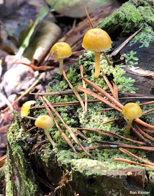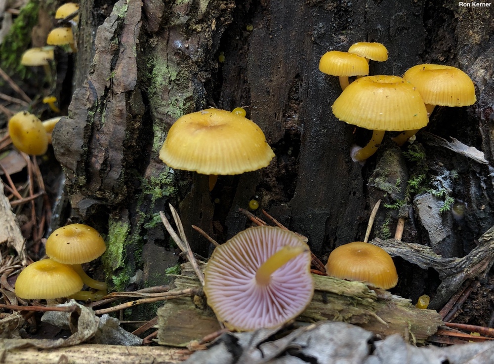 [ Basidiomycota > Agaricales > Hygrocybaceae > Chromosera . . . ] Chromosera lilacifolia by Michael Kuo, 26 December 2025 Rarely collected, this tiny omphalinoid mushroom appears on the well-rotted deadwood of conifers in eastern North America. Distinguishing features include its yellow cap and stem, contrasting nicely with its lilac gills, and its small size. Under the microscope Chromosera lilacifolia features smooth, inamyloid, flask-shaped spores, and lacks cystidia. Hygrocybe purpureofolia has similar colors but is larger (caps to 5 cm) and grows terrestrially, rather than from deadwood. The "Chromosera lilacifolia" appearing in western field guides (Arora 1986; Trudell & Ammirati, 2009; Desjardin, Wood & Stevens, 2014; Siegel & Schwarz, 2015) is a separate species, Chromosera loreleiae; it was named in 2025 (Grootmyers et al.). Eurasia's Chromosera cyanophila is also similar in appearance; it features bluish lilac gills. Chromosera lilacifolia totililacicolor is a variety with a lilac, rather than yellow, cap. Mycena lilacifolia is a former name. North American applications of the name Chromosera cyanophila refer to either Chromosera lilacifolia or Chromosera loreleiae (see above). Thanks to Ron Kerner for documenting, collecting, and preserving Chromosera lilacifolia for study; his collections are deposited in The Herbarium of Michael Kuo. Description: Ecology: Saprobic on the well-decayed wood of conifers (pines, spruces, and eastern hemlock); growing gregariously; spring through fall; originally described from New York (Peck 1878); fairly widely distributed in the Midwest and eastern North America; also recorded from Texas and Arizona. The illustrated and described collections are from Indiana. Cap: 5–20 mm across; broadly convex, developing a small central depression; sticky when fresh but soon dry; bald; dull brownish yellow; shallowly lined from the margin nearly to the center; the margin becoming slightly eroded with age. Gills: Beginning to run down the stem; nearly distant; short-gills frequent; pale purple. Stem: Up to 30 mm long and 2 mm thick; equal; dry or a little moist; bald; brownish yellow; basal mycelium whitish to pale lilac. Flesh: Insubstantial. Odor and Taste: Not distinctive. Spore Print: White. Microscopic Features: Spores 6–8 x 3–4 µm; amygdaliform or elongated-lacyrmoid; smooth; hyaline in KOH; inamyloid. Basidia 22–25 x 3–4 µm; 4-sterigmate. Hymenial cystidia not found. Pileipellis an ixocutis; elements 2–5 µm wide, smooth, thin-walled, hyaline in KOH; clamp connections present. REFERENCES: (C. H. Peck, 1878) D. Grootmyers, D. J. Lodge, S. A. Redhead, S.-T. Mullineux & S. D. Russell, 2025. (Murrill, 1916; Kauffman, 1918; Smith, 1947; Smith, Smith & Weber, 1979; Redhead et al., 1995; Lodge et al., 2013; Sturgeon, 2018; McKnight et al., 2012; Grootmyers et al., 2025.) Herb. Kuo 11031704, 04301901. This website contains no information about the edibility or toxicity of mushrooms. |