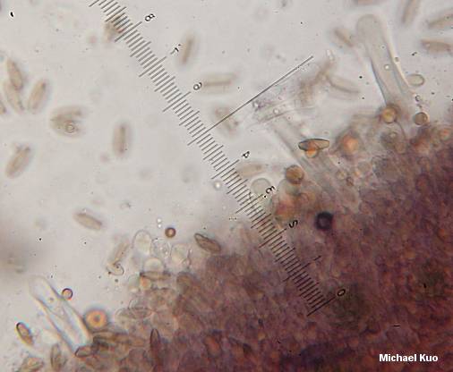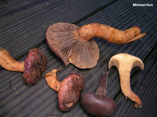 Chroogomphus vinicolor [ Basidiomycetes > Boletales > Gomphidiaceae > Chroogomphus . . . ] by Michael Kuo Pale orange flesh, a black spore print, gills that run down the stem, and cap that usually develops purplish red shades by maturity are the visible features that define this attractive species of Chroogomphus. Unfortunately for those who really care, the very similar Chroogomphus rutilus shares--or can share--these features. The cap color is so variable in both species that the best that can be said is that Chroogomphus vinicolor, as its Latin name suggests, is usually wine colored, while Chroogomphus rutilus is often more yellow or brown. Add to this confusion the fact that North American versions of "Chroogomphus rutilus" turn out to be quite distinct, genetically, from European versions--but genetically identical to Chroogomphus ochraceus (a species described from North America as having yellower colors but apparently varying to purplish red), necessitating a name change from rutilus to ochraceus on our continent. Ultimately, it is the thickness of the walls of the cystidia that appears to separate the two species morphologically; Chroogomphus vinicolor has thick-walled cystidia (the walls reach 5-7.5 µ at their widest points), while Chroogomphus Description: Ecology: Mycorrhizal with conifers, especially pines; growing alone, scattered, or gregariously (occasionally in small clusters); fall (over winter in coastal California); widely distributed in North America. Cap: 2-10 cm wide; irregularly pointed, bell-shaped, or convex; smooth or with tiny appressed hairs; slimy when fresh and young, but often dry and shiny or silky when collected; variable in color but often pale orangish to brownish or reddish brown--usually purplish red when mature. Gills: Running down the stem; distant or nearly so; pale orangish to yellowish at first, becoming grayish and finally blackish as the spores mature. Stem: 3-15 cm long; up to 2 cm wide; tapering to base; yellowish to pale orangish, developing reddish to purplish stains with age; sometimes with a ring zone from the collapsed partial veil. Flesh: Orange to pale orange or pinkish orange. Odor and Taste: Not distinctive. Chemical Reactions: Ammonia purple on cap surface and flesh; KOH purplish on cap surface and flesh; iron salts gray to black on cap, slowly blackish on flesh. Spore Print: Dark gray to black. Microscopic Features: Spores 17-23 x 4.5-7.5 µ; smooth; narrowly elliptical to nearly spindle-shaped. Cystidia fusoid-ventricose, spindle-shaped, or narrowly clavate; 112-164 x 13-20 µ; with walls reaching 5-7.5 µ wide, thickest in the middle portion. REFERENCES: (Peck, 1898) Miller, 1964. (Saccardo, 1902; Kauffman, 1925; Miller, 1964; Smith, Smith & Weber, 1979; Arora, 1986; States, 1990; Phillips, 1991/2005; Lincoff, 1992; Evenson, 1997; Barron, 1999; Miller, 2003; Roody, 2003; McNeil, 2006; Miller & Miller, 2006.) Herb. Kuo 01170502. This site contains no information about the edibility or toxicity of mushrooms. |