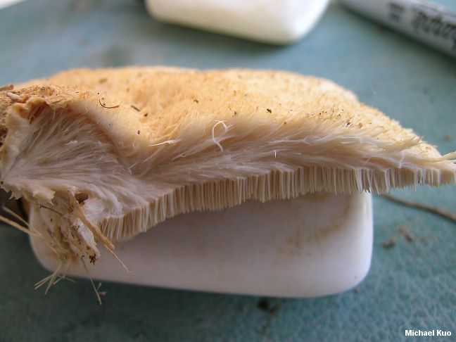 Climacodon pulcherrimus [ Basidiomycetes > Polyporales > Meruliaceae > Climacodon . . . ] by Michael Kuo Though it is apparently not uncommon, this fascinating toothed mushroom is almost never treated in field guides. From above, its hairy, shell-shaped cap is reminiscent of a polypore (perhaps a species of Trametes)--but its underside features densely packed spines. Originally described from South Carolina, Climacodon pulcherrimus has since been documented throughout much of eastern North America, as well as Texas and New Mexico--and, globally, in many tropical and subtropical areas. Distinctive features for Climacodon pulcherrimus include its whitish to pale tan or faintly orangish cap with a matted-hairy surface; its whitish teeth, which often darken or dry reddish brown; the pink to red reaction of the flesh to KOH; and microscopic features, including gorgeous double and multiple clamp connections in the hyphae of the flesh and cap surface. Steccherinum pulcherrimum, Creolophus pulcherrimus, and Donkia pulcherrima are synonyms--as is Hydnum kauffmanii, described by Peck (1907) from Michigan. Moreno and collaborators (2007) conclude that this species does not belong in Climacodon; other species in the genus have hymenial cystidia and lack multiple clamp connections--but the authors do not transfer Climacodon pulcherrimus to another genus. Description: Ecology: Saprobic on the deadwood of hardwoods (and occasionally conifers); causing a white rot; growing alone, gregariously, or in shelving clusters; summer; documented from eastern North America, Texas, and New Mexico--but apparently more common in tropical and subtropical areas. Cap: 4-11 cm across; broadly convex to flat; fan-shaped or semicircular in outline; dry; matted-hairy to woolly; whitish to pale tan or faintly orangish. Undersurface: Composed of spines up to 8 mm long; fairly tightly packed; whitish to faintly orangish when fresh, but often darkening or drying to reddish brown; with age often sticking together. Stem: Absent. Flesh: White; unchanging when sliced; somewhat fibrous. Odor and Taste: Not distinctive. Chemical Reactions: KOH pink to red on flesh and cap surface. Spore Print: White. Microscopic Features: Spores 4-6 x 1.5-3 µ; smooth; ellipsoid; inamyloid. Cystidia absent. Hyphal system monomitic. Hyphae of the context and pileipellis frequently with 1-4 clamp connections at septa. REFERENCES: (Berkeley & Curtis, 1849) Nikolajeva, 1961. (Saccardo, 1888; Peck, 1907; Coker, 1919; Maas Geesteranus, 1971; Metzler & Metzler, 1992; Moreno et al., 2007.) Herb. Kuo 07300702, 08070901. This site contains no information about the edibility or toxicity of mushrooms. |