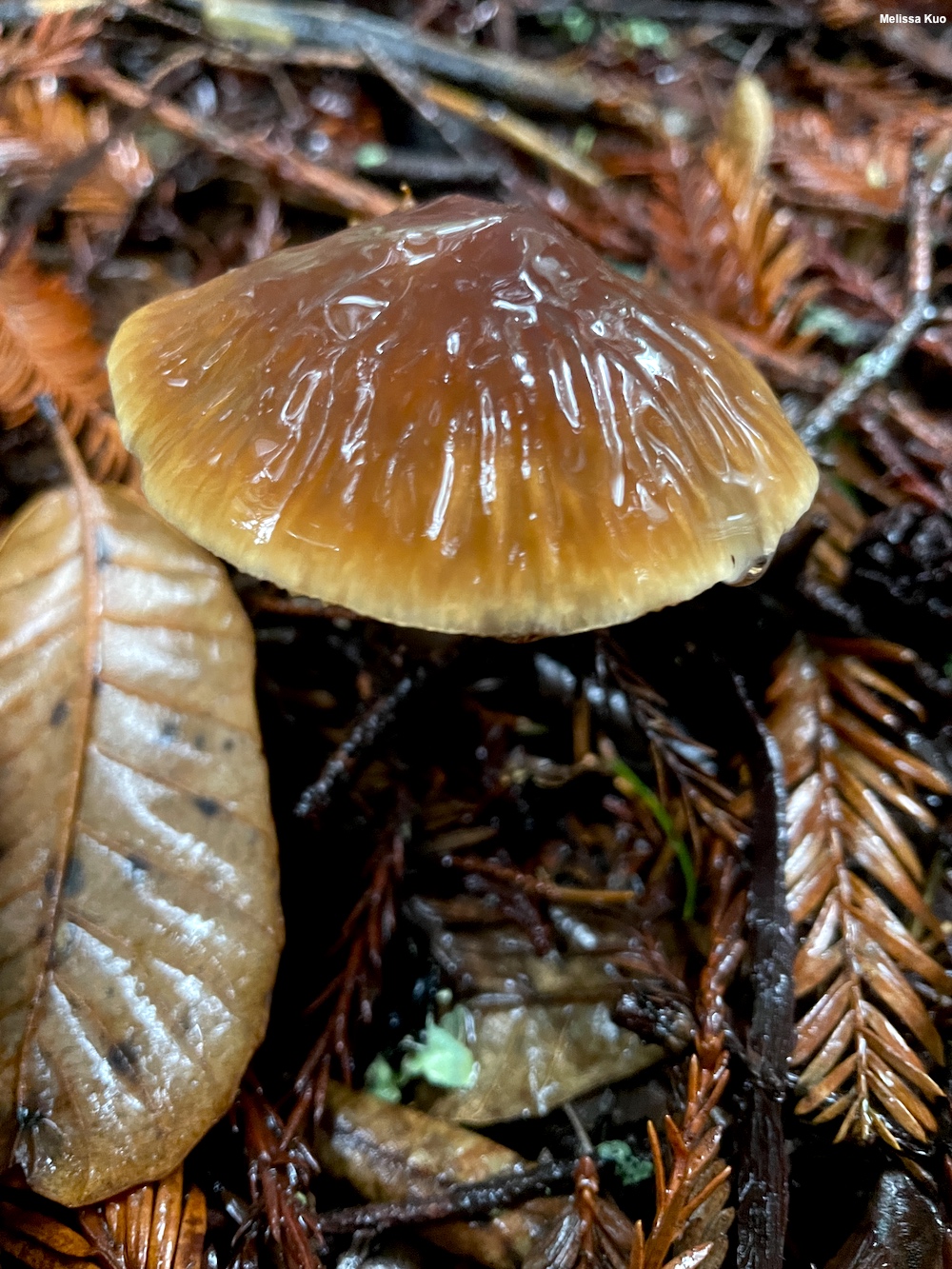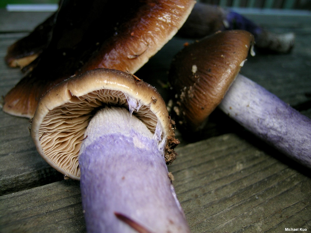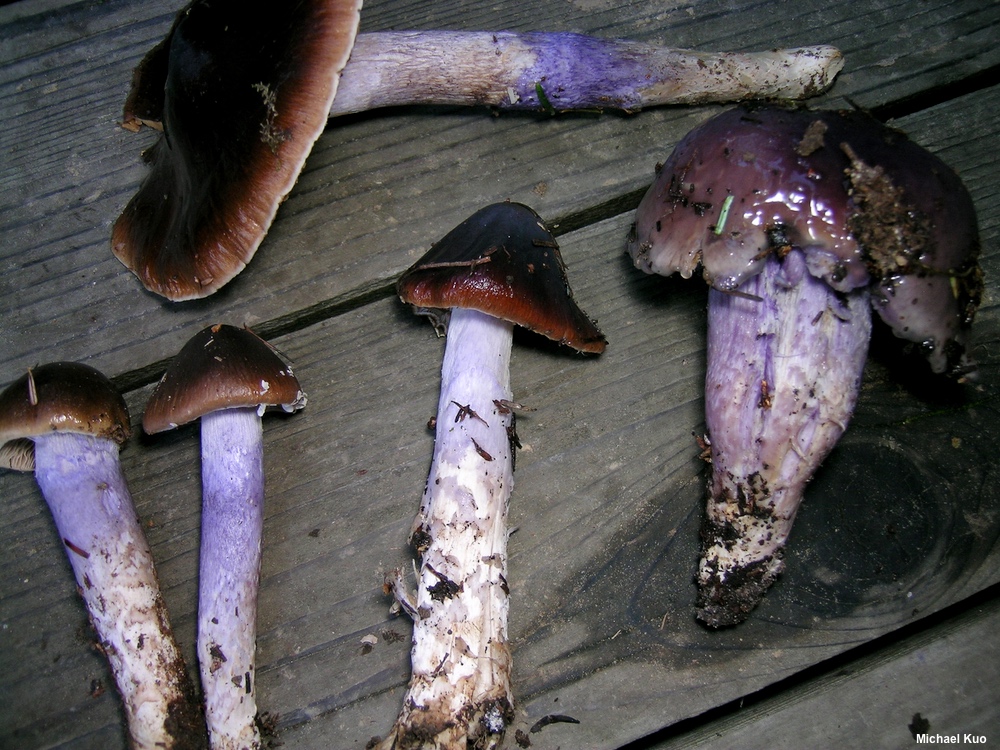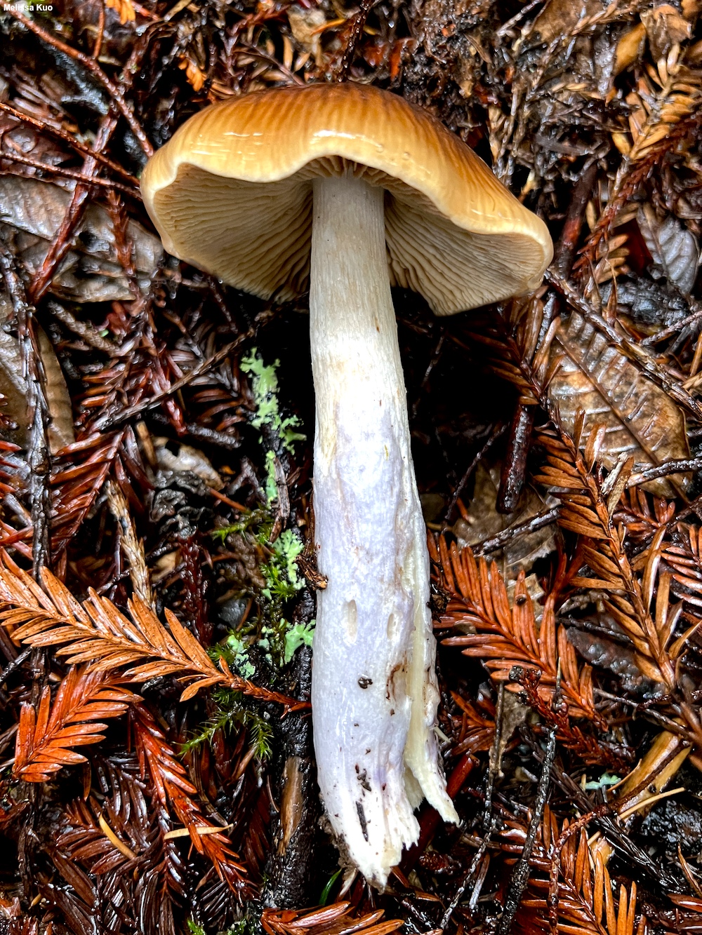 [Basidiomycota > Agaricales > Cortinariaceae > Cortinarius ... ] Cortinarius seidliae by Michael Kuo, 13 February 2024 The combination of brown and pale lilac doesn't usually come to mind when one imagines beautiful color schemes, but Cortinarius seidliae pulls it off with flair, and winds up being one of the most gorgeous mushrooms on the continent. Look for it under conifers in the Pacific Northwest and northern California. The whole mushroom is covered with a whitish to lilac slime veil when young, resulting in a slimy cap and a slimy lilac stem surface as the mushroom matures. Other distinguishing features include the young gills, which are brownish (not lilac or purple), and microscopic features, including large, flask-shaped spores and the absence of clamp connections. The mushroom featured here was called "Cortinarius vanduzerensis" for many years, but Ammirati and collaborators (in Ariyawansa et al. 2015) determined that the type collection of Cortinarius vanduzerensis was phylogenetically distinct from many collections identified as such. Cortinarius seidliae can be tentatively separated on the basis of its somewhat paler brown cap color and slightly wider spores. Cortinarius brunneoalbus, also recently named from this species group, is another conifer lover from the Pacific Northwest; it has a white, rather than lilac, stem. Description: Ecology: Mycorrhizal with conifers–especially spruces, firs, and Douglas-fir; growing alone, scattered, or gregariously; fall and winter; originally described from Oregon (Smith & Trappe 1972); distributed in the Pacific Northwest and northern California. The illustrated and described collections are from California. Cap: 4–9 cm; obscurely conical, becoming broadly conical or convex, with a central bump; thickly slimy when fresh; smooth when young, often wrinkled with maturity; dark brown, fading to cinnamon brown; appearing lined under the gluten. Gills: Narrowly attached to the stem; close; whitish when in the button stage, becoming pale brown and eventually rusty brown; short-gills frequent. Stem: 8–15 cm long; 1.5–2 cm thick; slightly tapered to apex; often rooting slightly; slimy; whitish to pale lilac above, darker lilac (resulting from the slime veil) below; somewhat shaggy underneath the slime; sometimes with a rusty ring zone. Odor: Not distinctive. Flesh: Whitish or tinged cinnamon. Spore Print: Rusty brown. Microscopic Features: Spores 11–17 x 7–8.5 µm; amygdaliform; very finely verrucose; brown in KOH. Basidia 40–45 x 10–12 µm; clavate; 4-sterigmate. Cystidia not found. Pileipellis an ixocutis of elements 3–5 µm wide, smooth; hyaline in KOH, without clamp connections. REFERENCES: J. F. Ammirati, T. Niskanen & K. Liimatainen, 2015. (Smith & Trappe, 1972; Smith, Smith & Weber, 1979; Arora, 1986; Schalkwijk-Barendsen, 1992; Seidl, 2000; Trudell & Ammirati, 2009; Kuo & Methven, 2010; Ariyawansa et al., 2015; Desjardin, Wood & Stevens, 2015; Siegel & Schwarz, 2016.) Herb. Kuo 01132401. This site contains no information about the edibility or toxicity of mushrooms. |