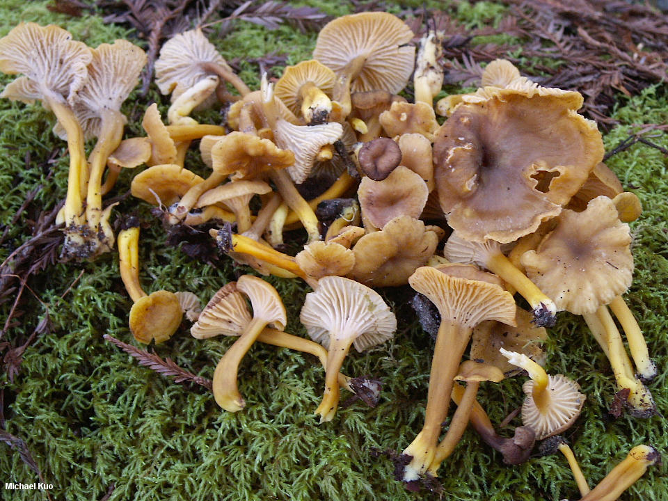 Craterellus species 02 [ Basidiomycota > Cantharellales > Cantharellaceae > Craterellus . . . ] by Michael Kuo DNA results from several studies support the idea that this West-Coast version of Craterellus tubaeformis is genetically distinct, and merits status as a separate species (see the extended discussion on the linked page for details). Like the eastern North American and European species, the West-Coast "tubie" features a yellow stem with a waxy surface, a brown cap, and well developed false gills that are often grayish at maturity. In fact it is not clear at the moment whether there are any morphological features that actually serve to separate the West-Coast species--but a careful study of many well-documented collections may be able to find something some day. The name "Craterellus neotubaeformis" was applied as a provisional name by Pilz and collaborators (2003) to the species discussed here, but the name has not been validly published. Description: Ecology: Mycorrhizal with conifers (including western hemlock, Douglas-fir, and Sitka spruce); growing gregariously or in loose clusters; usually growing from well-decayed woody debris (88% of the time, according to a 2004 study by Trappe); winter and spring; northern California to Alaska. The illustrated and described collections are from northern California. Cap: 2-5 cm wide; more or less convex at first; soon becoming vase-shaped and eventually becoming perforated in the center; with a wavy and irregular margin when mature; bald; sticky or waxy when fresh; dark yellowish brown, fading to dull yellowish brown or grayish brown with age; colors sometimes faintly streaked in radial patterns. Undersurface: Running down the stem; when young with ridges and folds; with age developing well-developed false gills that fork frequently and have cross-veins; yellowish to grayish or brownish. Stem: 3-8 cm high; 4-9 mm thick; more or less equal; becoming hollow; bald, with a waxy feel; usually bright yellow when young, becoming dull yellow to brownish; basal mycelium whitish. Flesh: Insubstantial; yellowish to whitish. Odor and Taste: Taste mild; odor not distinctive, or slightly fragrant. Spore Print: White to yellowish. Microscopic Features: Spores 8-12 x 6-10 µ broadly ellipsoid or, occasionally, subglobose; smooth; hyaline in KOH; contents homogeneous and minutely granular. Basidia 65-75 µ long; 4-sterigmate. Elements of upper surface cylindric; septate; hyaline to brownish; 5-10 µ wide; clamped. REFERENCES: (Smith & Morse, 1947; Thiers, 1985; Arora, 1986; Dahlman et al., 2000; Pilz et al., 2003; Trappe, 2004; Trudell & Ammirati, 2009; Guo-ying et al., 2011.) Herb. Kuo 02200305. This site contains no information about the edibility or toxicity of mushrooms. |
