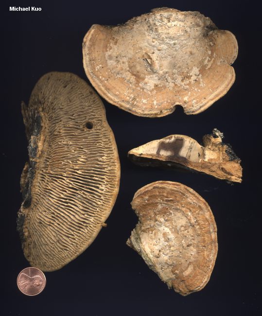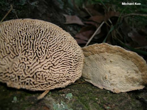 Daedalea quercina [ Basidiomycetes > Polyporales > Fomitopsidaceae > Daedalea . . . ] by Michael Kuo Daedalea quercina, as its species name suggests, is partial to oaks. It is a distinctive polypore with a thickly maze-like pore surface (as its genus name suggests; Daedalus designed the maze that hid the Minotaur) and a whitish to grayish or brownish cap surface. The tough flesh is whitish to pale brownish--but never rusty brown or dark brown. Species of Gloeophyllum can look somewhat similar, but feature brown to rusty brown flesh and gill-like undersurfaces. Daedaleopsis confragosa is similar, but its maze-like pore surface is less regular, has thin walls, and usually bruises reddish. Lenzites betulinus has a gill-like undersurface. Description: Ecology: Saprobic; growing alone or in small groups with fused caps on decaying oak wood (occasionally on the wood of other hardwoods); annual or perennial; causing a brown rot of the heartwood; widely distributed in North America, but rare west of the Mississippi. Cap: 4-20 cm; broadly convex to more or less flat; fan-shaped in outline; dry; smooth or finely fuzzy (generally smoother toward the margin); whitish when fresh, but grayish, brown, or black in age (often darker toward the point of attachment in specimens that are several years old). Undersurface: Maze-like, with thick walls (about 1-3 mm wide); occasionally developing pore-like or gill-like areas; whitish when fresh, becoming dingy yellowish or pale tan; not bruising; tubes to 4 cm deep. Stem: Absent. Flesh: Whitish, or with age brownish; very tough. Spore Print: White. Chemical Reactions: All parts dark gray to black with KOH. Microscopic Features: Spores: 5-6 x 2-3.5 µ; smooth; cylindrical to elliptical. REFERENCES: (Linnaeus, 1753) Persoon, 1801. (Saccardo, 1888; Overholts, 1953; Smith, Smith & Weber, 1981; Arora, 1986; Gilbertson & Ryvarden, 1986; Phillips, 1991/2005; Lincoff, 1992; Barron, 1999; McNeil, 2006; Miller & Miller, 2006; Binion et al., 2008.) Herb. Kuo 04230404, 07120901, 07210903. This site contains no information about the edibility or toxicity of mushrooms. |