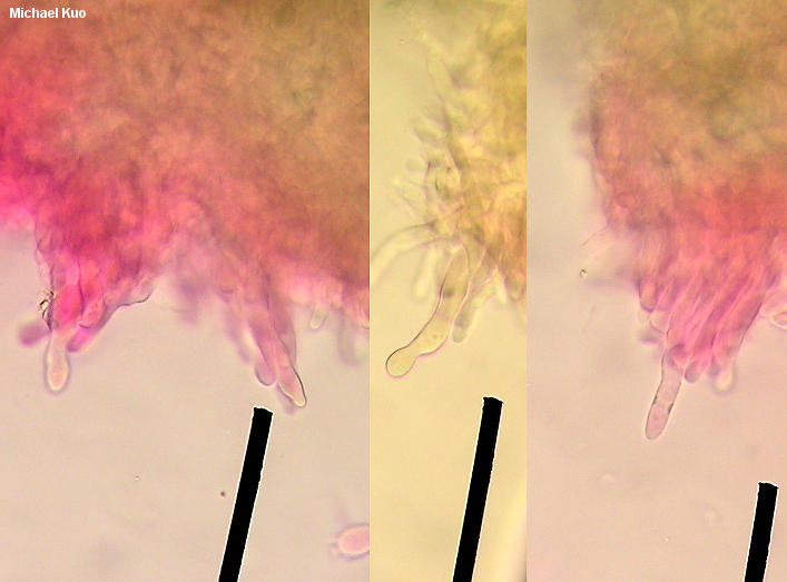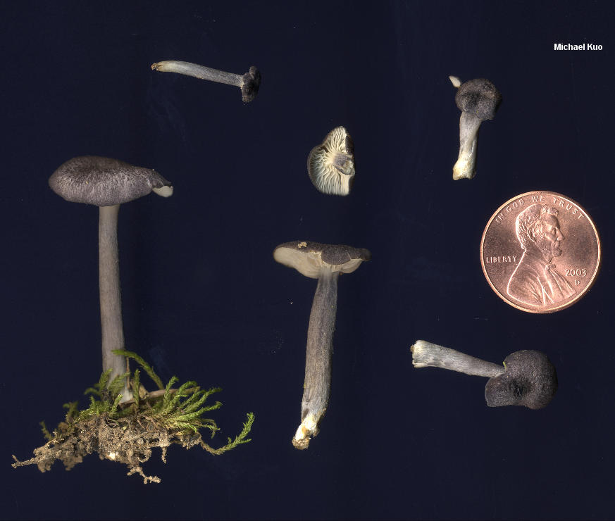 Entoloma mougeotii [Basidiomycota > Agaricales > Entolomataceae > Entoloma . . . ] by Michael Kuo Here is a small entolomatoid mushroom with a gorgeous, grayish purple cap and stem. The cap is finely scaly, especially over the center, and its margin is not lined. The gills are white at first, later turning pinkish as the spores mature. The stem has a white apex, and white basal mycelium. Under the microscope Entoloma mougeotii features spores with many (often poorly defined) angles, and clavate to cylindric cheilocystidia. Similar species have either smaller or larger spores, and/or lack cheilocystidia. Entoloma mougeotii is a European species and, as is frequently the case with North American entolomas, our use of the European species name may simply represent a best-fit scenario. Description: Ecology: Saprobic; growing gregariously in moss and in disturbed ground, or grassy areas (path sides, road banks, and so on); summer; North American distribution uncertain (recorded from North Carolina and Tennessee by Hesler, 1967; the collection illustrated and described here is from Illinois--also, I wonder how many "Entoloma nigroviolaceum" collections in North American herbaria were identified with field guides and might represent Entoloma mougeotii once examined under the microscope). Cap: 1-2 cm; planoconvex with a slightly incurved margin at first, becoming shallowly depressed, with or without a small umbo; dry; minutely fibrillose and scaly; dark purple-gray at first, fading slightly with maturity, or appearing paler due to the break-up of the cuticle. Gills: Attached to the stem; close; white at first, becoming pink; short-gills frequent. Stem: 2.5-5 cm long; 2-4 mm thick; equal; dry; bald or finely silky; white at the apex but colored like the cap overall; basal mycelium white. Flesh: Thin; insubstantial; watery whitish to grayish. Odor and Taste: Odor somewhat fragrant and spicy, or not distinctive; taste not distinctive. Spore Print: Pink. Microscopic Features: Spores 9-11 x 5-6 µ; 5- to 9-sided, but with irregular and often shallow angles, making precise determination of the outline difficult; heterodiametric; smooth; hyaline. Pleurocystidia absent. Cheilocystidia cylindric-flexuous with rounded, subclavate, clavate, or subcapitate apices; 35-65 x 5-7.5 µ; thin-walled; clearly differentiated. Pileipellis a cutis with frequent areas of ascending or trichoderm-like elements; terminal elements clavate or subcystidioid and inflated; brown to brownish in 10% ammonia, with intracellular pigment. Clamp connections present. REFERENCES: (Fries, 1874) Hesler, 1967. (Saccardo, 1891; Hesler, 1967; Noordeloos, 1988; Breitenbach & Kränzlin, 1995; Noordeloos, 2008.) Herb. Kuo 06180401. This site contains no information about the edibility or toxicity of mushrooms. |
