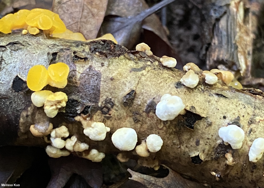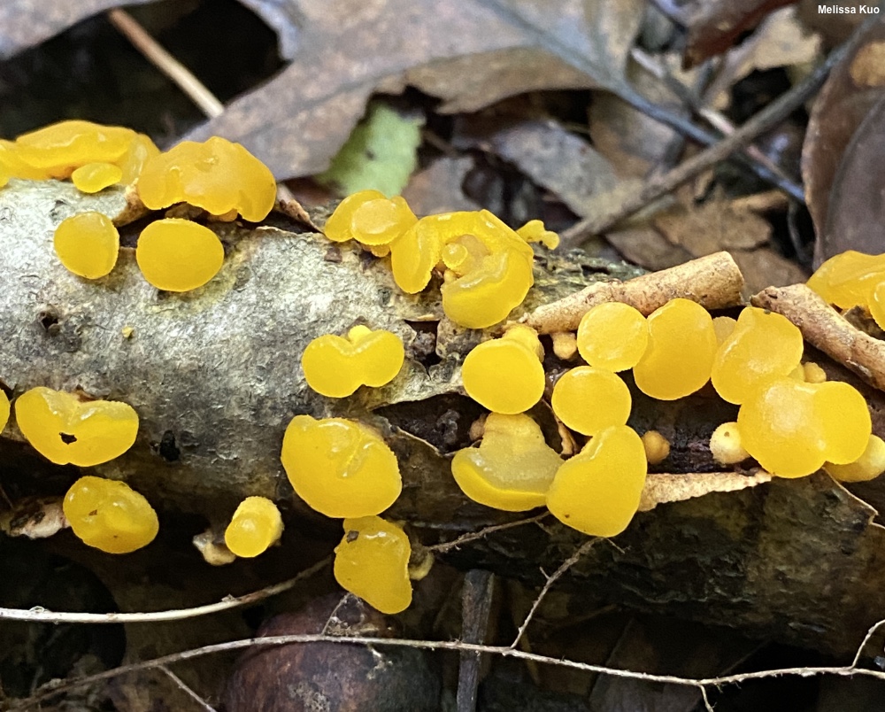 Femsjonia peziziformis [ Basidiomycota > Dacrymycetales > Dacrymycetaceae > Femsjonia ... ] by Michael Kuo On casual inspection Femsjonia peziziformis looks like any number of small, blob-ish, yellow jelly fungi. However, "casual inspection" is not even in your repertoire, is it, Captain Jelly Fungus? It's not likely that you, Supreme Cataloguer of Minutiae, will miss the flattened upper surface and the finely fuzzy, whitish sides. "This is no ordinary blob," you will proclaim. And then, to the amazement of all, you will produce your Captain's Microscope to demonstrate, wait for it, clamp connections, Y-shaped basidia, and septate spores! Boom. We are not worthy. We merely bask in the aura of your jelliness. Femsjonia luteoalba and Ditiola peziziformis are synonyms. Description: Ecology: Saprobic; growing scattered to gregariously on the wood of hardwoods; found year-round; originally described from France; widely distributed in Europe; in North America distributed from roughly the Great Plains eastward. The illustrated and described collections are from Illinois. Fruiting Body: 3–8 mm across; 2–5 mm high; top-shaped to cushion shaped; upper surface flattened, yellow to brownish yellow, bald, shiny, and moist when fresh; undersurface (the sides) finely fuzzy, whitish to pale yellow; flesh yellow and gelatinous. Odor: Not distinctive. Microscopic Features: Spores 15–22 x 5–10 µm; allantoid; smooth; hyaline in KOH, with many oil droplets; becoming septate with 7 or more septa; developing digitate projections with germination. Probasidia 75–100 x 5–7.5 µm; cylindric to clavate; clamped at the base; hyaline or with golden yellow, globular contents. Basidia Y-shaped. Contextual hyphae of two types: 2–3 µm wide, thin-walled, smooth, hyaline in KOH—or 3–6 µm wide, with thicker (0.5–1 µm) walls, smooth. Clamp connections present. REFERENCES: (J. -H. Léveillé, 1848) P. Karsten, 1876. (Brasfield, 1938; Overholts, 1940; Martin, 1952; Olive, 1953; Kennedy, 1958; McNabb, 1965; Reid, 1974; Breitenbach & Kränzlin , 1986; Shirouzu et al., 2009; Buczacki et al., 2012; Shirouzu et al., 2017; Læssøe & Petersen, 2019; Zamora & Ekman, 2020.) Herb. Kuo 07151401, 08022002. This site contains no information about the edibility or toxicity of mushrooms. |
