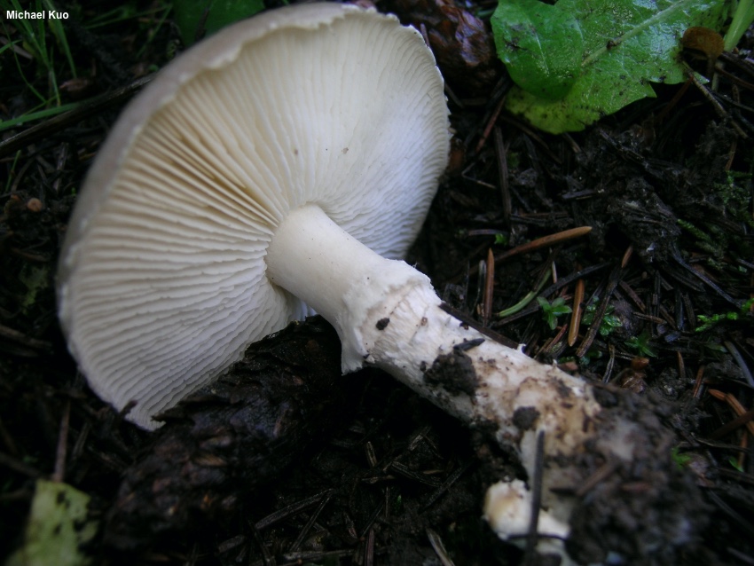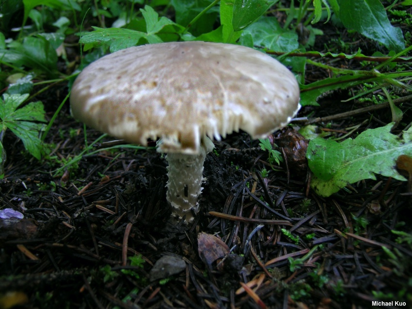 Floccularia fusca [ Basidiomycota > Agaricales > Agaricaceae > Floccularia . . . ] by Michael Kuo Apparently limited to the Rocky Mountains, Floccularia fusca is recognized by its gray to pale grayish brown cap, which features a zone of white partial veil remnants along the edge; its white spore print and gills; its stem, which is sheathed in whitish shagginess; and, under the microscope, its smooth, amyloid spores. The species is associated with conifers (Douglas-fir in the northern Rocky Mountains and Engelmann spruce and subalpine fir in the southern Rockies) and is usually found growing alone, or with a few individuals scattered around the same general area. Other species of Floccularia may be found in the same ecosystems, but are differently colored, ranging from brownish yellow to bright yellow—with the exception of a whitish form of Floccularia albolanaripes, which can be separated by the pale yellowish streaks and scales on its cap surface. Armillaria fusca is a previous name. Description: Ecology: Mycorrhizal with conifers, including Douglas-fir in the northern Rocky Mountains and Engelmann spruce and subalpine fir in the southern Rockies; terrestrial, growing alone or scattered; late summer and fall; Rocky Mountains. The illustrated and described collections are from Colorado. Cap: 3–6 cm; convex when young, becoming planoconvex; moist when fresh but soon dry; bald at first but often developing radial, appressed fibrils or scales with age; grayish brown, pale grayish, or nearly whitish; sometimes developing a streaked appearance; the margin often adorned with white partial veil remnants. Gills: Attached to the stem by a notch; close; short-gills frequent; white or creamy. Stem: 3–6 cm long; 0.5–1.5 cm thick; more or less equal, or narrowing a bit toward the base; white and bald near the apex; sheathed below with shaggy zones of soft white scales; sometimes with a collapsed, whitish ring; sometimes developing yellowish discolorations in the basal half with age; basal mycelium white. Flesh: White; not changing on exposure. Odor and Taste: Not distinctive. Chemical Reactions: KOH on cap surface negative to dull orange; iron salts on cap surface negative. Spore Print: White. Microscopic Features: Spores 6–7 x 4–5 µm; ellipsoid; smooth; weakly amyloid. Lamellar trama parallel. Basidia 4-sterigmate. Hymenial cystidia not found. Pileipellis a cutis; elements 5–10 µm wide, smooth, thin-walled, hyaline in KOH; clamp connections present but often small and inconspicuous. REFERENCES: (Mitchel & Smith, 1976) Bon, 1990. (Mitchel & Smith, 1976; Smith, Smith & Weber, 1979; Phillips, 1991/2005; Cripps, Evenson & Kuo, 2016.) Herb. Kuo 08080505, 08150702, 08150703. This site contains no information about the edibility or toxicity of mushrooms. |