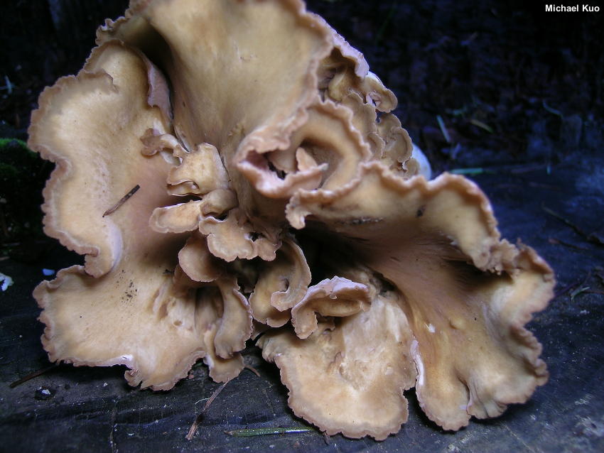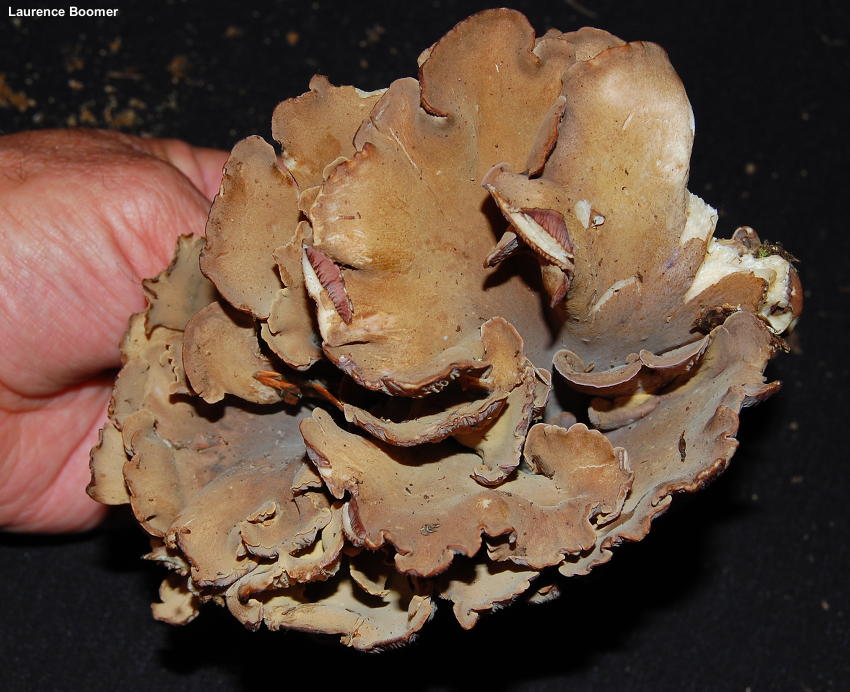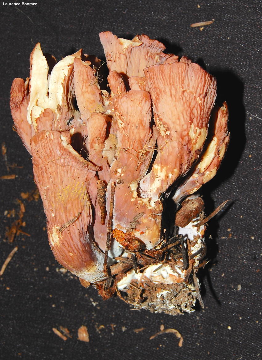 Gomphus clavatus [ Basidiomycota > Gomphales > Gomphaceae > Gomphus . . . ] by Michael Kuo Sometimes called "pig's ears," Gomphus clavatus is an odd mushroom. One, two, or more irregularly shaped, lobed caps arise from a common stem, and the mushroom's underside is wrinkled and purplish. It is a mycorrhizal partner with northern and montane conifers—especially spruces and firs. Gomphus clavatus is a European species, first named in 1796 by Persoon. Research from Giachini (2004) has more or less upheld the traditional concept of Gomphus clavatus—which is now apparently the only North American species of Gomphus, since other former Gomphus species on our continent have been transferred to other genera (notably, Turbinellus). See the page on gomphoid mushrooms for details. Gomphus brevipes and Gomphus truncatus are identical to Gomphus clavatus, according to Giachini, and should be treated as synonyms. Thanks to Laurence Boomer for collecting, documenting, and preserving Gomphus clavatus for study; his collection is deposited in The Herbarium of Michael Kuo. Description: Ecology: Mycorrhizal with conifers (especially spruces and firs); growing alone, scattered, or gregariously; summer and fall—or over winter on the West Coast; originally described from Bavaria; widespread in Europe; in North America distributed in northern and montane areas, and in the Pacific Northwest. The illustrated and described collections are from California and Oregon. Fruiting Body: By maturity with one, two, or more caps arising from a shared stem and often fusing together at their edges; up to 15 cm high and 20 cm across. Cap: Lobed and irregular in outline; broadly convex at first, becoming shallowly to deeply depressed; dry; bald or with a few scattered, tiny scales; pale brown with lilac shades when fresh, fading to creamy tan. Undersurface: Running down the stem; deeply wrinkled and cross-veined; dark lilac or purple when young but usually fading to pale lilac. Stem: Often difficult to define with precision, but usually about 2–4 cm high and 1–3 cm wide; whitish below; lilac near the undersurface; sometimes bruising reddish brown; bald above, but with a somewhat velvety base; basal mycelium white. Flesh: Yellowish white to pale lilac. Odor and Taste: Not distinctive. Spore Print: Brownish. Microscopic Features: Spores 11–16 x 4.5–6.5 µm; long-ellipsoid to subamygdaliform; often flattened on the abaxial side; verrucose; hyaline to brownish in KOH, with numerous oil droplets. Basidia 50–65 x 10–12 µm; subclavate; 4-sterigmate. Cystidia not found. Clamp connections present. REFERENCES: (Persoon, 1796) Gray, 1821. (Fries, 1821; Saccardo, 1888; Corner, 1966; Smith, 1968; Smith, Smith & Weber, 1981; Thiers, 1985; Arora, 1986; Breitenbach & Kränzlin, 1986; Phillips, 1991/2005; Lincoff, 1992; Persson, 1997; Barron, 1999; Pilz et al., 2003; Roody, 2003; Giachini, 2004; McNeil, 2006; Miller & Miller, 2006; Kuo, 2007; Nonis, 2007; Trudell & Ammirati, 2009; Giachini & Castellano, 2011; Buczacki et al., 2012; Desjardin, Wood & Stevens, 2015; Evenson, 2016; Siegel & Schwarz, 2016; baroni, 2017; Gminder & Böhning, 2017; Læssøe & Petersen, 2019; McKnight et al., 2021; MacKinnon & Luther, 2021.) Herb. Kuo 09051301. This website contains no information about the edibility or toxicity of mushrooms. |