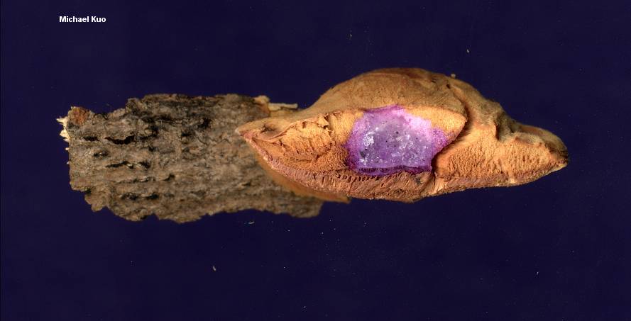 Hapalopilus nidulans [ Basidiomycota > Polyporales > Phanerochaetaceae > Hapalopilus . . . ] by Michael Kuo This nondescript, fleshy, dull orangish polypore is often overlooked; it tends to blend in with its surroundings. A drop of KOH anywhere on the fruitbody, however, produces a rather stunning color change to purple or lilac (see the illustration). Truth be told, KOH is probably not required for successful identification—but it's fun! Like viewing the horned cystidia of Pluteus cervinus or watching the sea-green color change of Boletus separans in ammonia, it's one of those things a true mushroom geek never tires of. Absent the KOH reaction, Hapalopilus nidulans is recognized by its dull orange colors, its fairly fleshy consistency, the absence of a stem, and the small, angular pores. In eastern North America it is found on hardwood logs and debris, but in the southwest it favors conifer wood. My collections (all from Illinois) have somewhat smaller spores than what is usually reported for the species. Polyporus nidulans is a former name; Hapalopilus rutilans is a synonym. Description: Ecology: Saprobic; growing alone or in small groups on decaying logs and sticks; on hardwood debris in the east, or conifer wood in the southwest; causing a white rot; spring to fall, or over winter in warmer climates; widely distributed east of the Rocky Mountains, and occasionally reported in the southwest and Pacific Northwest. The illustrated and described collections are from Illinois. Cap: 2.5–7 cm across; 1–3 cm deep; irregularly semicircular or kidney-shaped; convex; bald or finely suedelike; wrinkled in places; evenly dull orange to dull orangish cinnamon; when fresh and growing with a paler, yellowish to whitish margin. Pore Surface: Dull orangish brown; not bruising, or bruising slightly darker; with a sterile marginal band; with 2–3 angular pores per mm; tubes 2–4 mm deep. Stem: Absent. Flesh: Dull orangish brown or paler; watery and soft at first, but later quite tough and hard; not changing when sliced. Odor and Taste: Not distinctive. Chemical Reactions: KOH bright purple to lilac on all parts. Spore Print: White. Microscopic Features: Spores 2.5–3.5 x 1.5–2.5 µm; ellipsoid; smooth; inamyloid; hyaline in KOH. Basidia 4-sterigmate. Setae, cystidia not found. Hyphal system monomitic, with conspicuous clamp connections. REFERENCES: (Fries, 1821) Karsten, 1881. (Overholts, 1953; Smith, Smith & Weber, 1981; Gilbertson & Ryvarden, 1986; Phillips, 1991/2005; Lincoff, 1992; Barron, 1999; Roody, 2003; McNeil, 2006; Binion et al., 2008; Kuo & Methven, 2014.) Herb. Kuo 07160304, 07060701, 06260902, 06221802. This site contains no information about the edibility or toxicity of mushrooms. |
