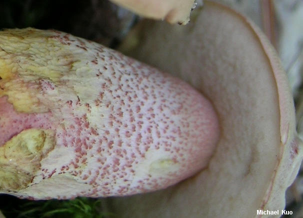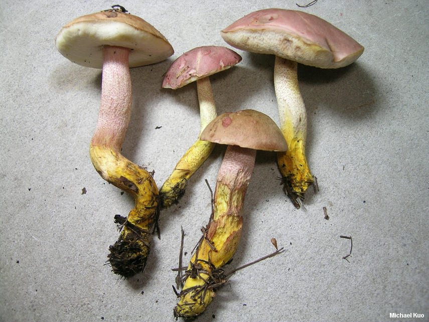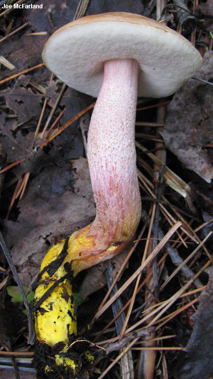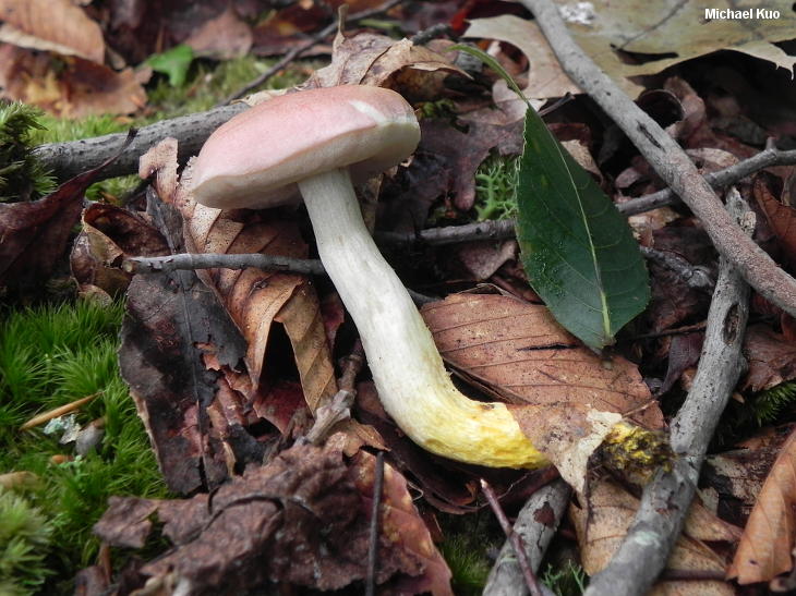 Harrya chromapes [ Basidiomycota > Boletales > Boletaceae > Harrya . . . ] by Michael Kuo Here is a gorgeous bolete, easily recognized by its pinkish young cap (which becomes more brown with age), its chrome yellow stem base, and the pink scabers on the surface of its stem. It is mycorrhizal--but it appears to be mycorrhizal "generalist," able to form mycorrhizae with a wide variety of trees, including both hardwoods and conifers. In North America, Leccinum chromapes is found in the eastern and midwestern United States, in Texas, and in Mexico. Your field guide probably calls this mushroom "Tylopilus chromapes" or "Leccinum chromapes." I would love to do the same (see my mini-rant on the page for boletes), but those wacky boletologists have gone and erected an entire genus to hold this species and its rarely collected Costa Rican cousin, Harrya atriceps, which has a black cap and yellow scabers.