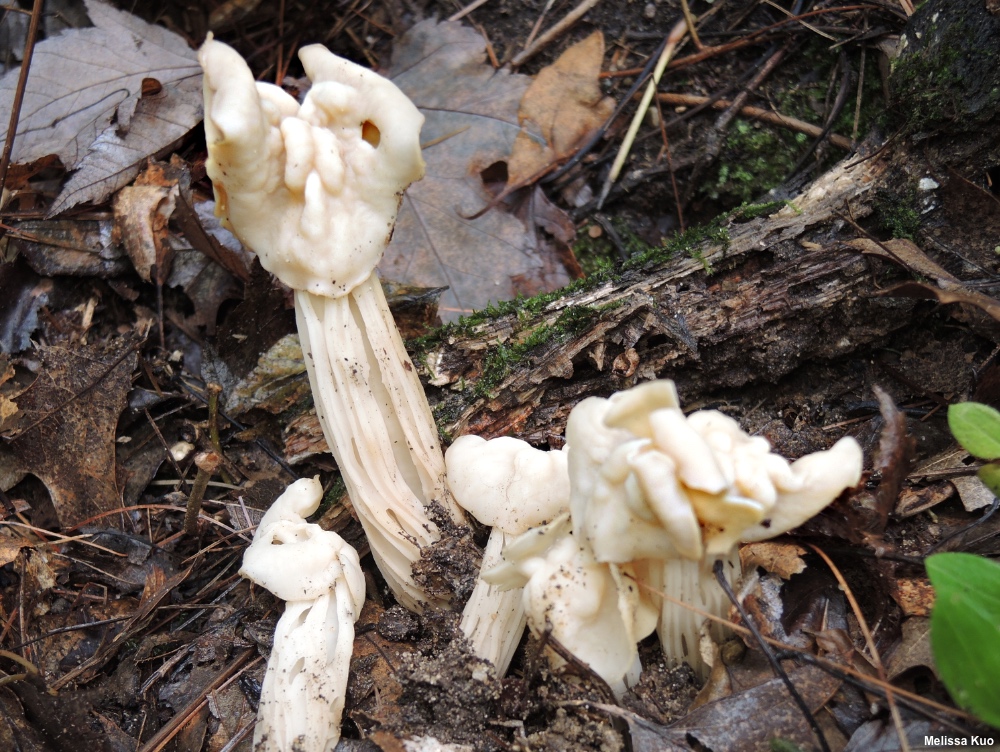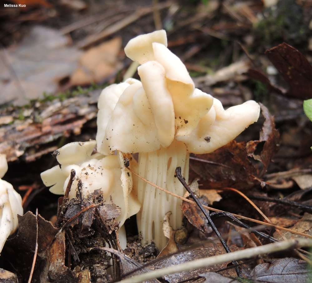 [ Ascomycota > Pezizales > Helvellaceae > Helvella . . . ] Helvella crispa by Michael Kuo, 29 October 2022 This astonishing mushroom is fairly easily distinguished by its creamy white colors and its ornately fluted stem; it looks like something on the set of The Lord of the Rings. Additional identifying features include the finely fuzzy undersurface of the cap, and the fact that the edges of the cap are not fused with the stem. Similar species include Helvella lactea, which has a cap that tends to be saddle-shaped more regularly and a shorter, stubbier stem; Helvella pallescens, with a cap margin that becomes fused with the stem in places; and albino forms of Helvella lacunosa, with bald undersurfaces. Helvella crispa was originally described from Europe, and it occurs in North America—for the time being. However, the writing is already sketched on the DNA wall, and it is clear from preliminary results (e.g. Skrede et al. 2017) that the crispa-like species of North America are likely to be several, and to receive new names, as has already happened in China (Zhao et al. 2015). Thanks to Hoa Pham for documenting, collecting, and preserving Helvella crispa for study; her collection is deposited in The Herbarium of Michael Kuo. Description: Ecology: Possibly mycorrhizal; growing alone or gregariously under conifers or hardwoods, on rotting wood or terrestrially (often in disturbed-ground locations); summer and fall, or over winter in warm climates; originally described from Carniola, in present-day Slovenia (Scopoli 1772) and epitypified from Sweden (Skrede et al 2017); widely distributed in Europe and, as a morphological species, reported from central Asia and throughout North America. The illustrated and described collections are from Colorado, Michigan, and Pennsylvania. Cap: 1.5–7 cm high; 1.5–4 cm wide; saddle-shaped and/or irregularly lobed; surface bald and smooth or slightly wrinkled; white to creamy or pale yellowish; undersurface finely fuzzy (use a hand lens), colored like the upper surface or slightly darker; the margin often curled upwards in places, not becoming fused with the stem where contact occurs. Stem: 3–12 cm long; 0.5–3.5 cm wide; white; deeply and ornately ribbed, with cross-veins and pockets. Flesh: Thin; brittle; often chambered in the stem; whitish; not changing when sliced. Odor: Not distinctive. Microscopic Features: Spores 16–21 x 11–15 µm; broadly ellipsoid; smooth; with one large, central oil droplet and, sometimes, several smaller droplets at each end; hyaline in KOH. Asci 225–275 x 10–17.5 µm; 8-spored. Paraphyses exceeding the asci by 10–30 µm; 3–5 µm wide, with clavate apices 5–12.5 µm wide. Excipular surface trichoderm-like; terminal elements appearing "cellular" from above, 8–18 µm across, smooth, hyaline in KOH. REFERENCES: (G. A. Scopoli, 1772) E. M. Fries, 1822. (Anderson & Ickis, 1921; Dennis, 1968; Eckblad, 1968; Kempton & Wells, 1970; Weber, 1972; Phillips, 1981; Smith, Smith & Weber, 1981; Breitenbach & Kränzllin, 1984; Arora, 1986; Phillips, 1991/2005; Schalkwijk-Barendsen, 1991; Lincoff, 1992; Mezler & Mezler, 1992; Abbott & Currah, 1997; Barron, 1999; Roody, 2003; Spooner, 2003; McNeil, 2006; Miller & Miller, 2006; Nonis, 2007; Buczacki et al., 2013; Landeros & Guzmán-Dávalos, 2013; Beug et al., 2014; Kuo & Methven, 2014; Landeros et al., 2014; Evenson, 2015; Landeros et al., 2015; Zhao et al., 2015; Gminder & Böhning, 2017; Skrede et al., 2017; Woehrel & Light, 2017; Læssøe & Petersen, 2019; Skrede et al., 2020; McKnight et al., 2021.) Herb. Kuo 09120501, 09281910, 09182104, 08162201. This site contains no information about the edibility or toxicity of mushrooms. |