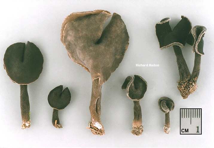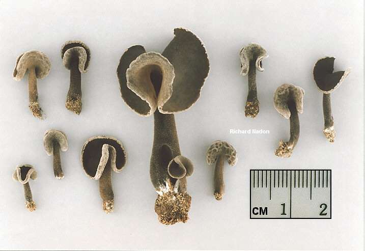 The North American range of Helvella pezizoides appears to be limited to boreal (or nearly boreal) regions, but since the species is so infrequently collected it is unclear whether it might be expected elsewhere. Helvella atra is a similar species; it features a cap margin that is not usually rolled up, and an undersurface that is smooth or merely finely fuzzy. Thanks to the Herbarium of the University of Michigan for facilitating study of the collections cited below. Description: Ecology: Probably mycorrhizal; growing alone or gregariously under hardwoods or conifers, on the ground or on rotting wood; summer and fall; in northern forests from Michigan to Alaska. Cap: 1.5-5 cm; loosely saddle-shaped, typically forming a deep fold--or somewhat irregular; dark brownish gray to black; the margin rolled upwards when young and often remaining upturned at maturity; undersurface densely fuzzy or hairy, grayish, often ingrown with the stem where contact occurs. Flesh: Thin; brittle. Stem: 3-4 cm long; to 1 cm thick; colored like the cap; smooth or finely fuzzy. Microscopic Features: Spores: 16-21 x 10-13 µ; elliptical; with one large oil droplet; smooth. Paraphyses cylindric, developing subclavate to clavate apices; hyaline to ochraceous or brownish; up to 8 µ wide. Excipular surface elements hyaline to brownish; often arranged in bundles; frequently septate; terminal cells pyriform to clavate, up to 20 µ wide. REFERENCES: Afzelius, 1783. (Saccardo, 1889; Weber, 1972; Smith, Smith & Weber, 1981; Abbott & Currah, 1997.) Herb. MICH 22490 (N. J. Smith 560), 22494 (N. J. Smith 2239). This site contains no information about the edibility or toxicity of mushrooms. |