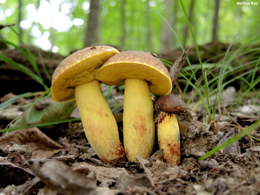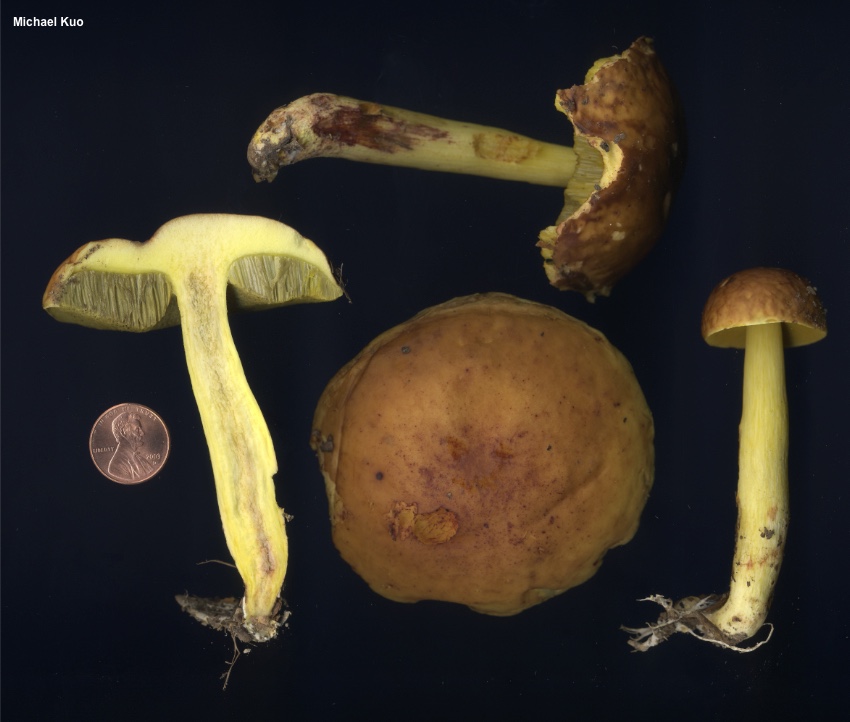 Hemileccinum subglabripes [ Basidiomycota > Boletales > Boletaceae > Hemileccinum . . . ] by Michael Kuo Hemileccinum subglabripes grows under oaks in the southern part of its range, and under birch or aspen in its northern range. Its stem is fairly long and slender, and its proportions are usually more Leccinum-like than Boletus-like. The yellow stem surface is adorned with scabers like those found in Leccinum, but in Hemileccinum subglabripes the scabers are inconspicuous and tiny, usually best observed with a hand lens; Peck's species name subglabripes, Latin for "nearly smooth-stemmed," is very appropriate—as is his comment that "the branny particles on the stem are pale and easily overlooked" (1889, p. 112). The flesh is yellow, and it does not change color dramatically when sliced (though it may turn slightly reddish and/or pale blue in a few spots). The cap is brown to cinnamon brown or orangish brown, and its surface is bald, sometimes developing a slightly wrinkled appearance. Hemileccinum hortonii is very similar, but has a consistently corrugated cap surface that turns green with a drop of ammonia, and different terminal cells in the pileipellis. Boletus subglabripes and Leccinum subglabripes are synonyms, as is Boletus flavipes. Thanks to Sibylla Brown for documenting, collecting, and preserving Hemileccinum subglabripes for study; her collection is deposited in The Herbarium of Michael Kuo. Description: Ecology: Mycorrhizal with hardwoods, including birch, aspen, oaks, and hickories; appearing alone or gregariously; summer and fall; widely distributed in northern and eastern North America; also appearing in the northern Rocky Mountains. The illustrated and described collections are from Iowa, Illinois, Michigan, and Minnesota. Cap: 3–10 cm; convex, becoming broadly convex; dry; bald, or occasionally very slightly velvety when young; smooth or occasionally a little wrinkled; brown to olive brown or orangish brown when young, maturing to medium brown, paler olive brown, reddish brown, orangish brown, or tan; without a sterile overhanging margin. Pore Surface: Bright yellow when young, becoming olive yellow to dirty green; not bruising; 1–3 angular pores per mm at maturity; tubes to 15 mm deep; by maturity usually depressed at the stem. Stem: 4.5–10 cm long; 1–2 cm thick; fairly equal; often a little curved near the base; occasionally tapered to a somewhat rooting base; very finely scabrous with tiny (use a lens) scabers that are initially yellow but mature to reddish; overall appearing yellow at first, then slowly developing red colors from the base upwards; very rarely bruising a little bluish; basal mycelium white. Flesh: Pale yellow or rarely whitish in cap; dark yellow in stem; not staining on exposure—or staining slowly slightly pinkish or, occasionally, pale blue; sometimes red in the stems of older specimens. Odor and Taste: Odor not distinctive; taste slightly sour. Chemical Reactions: Ammonia pink or negative on cap surface; often pale blue on flesh after some time, but also sometimes negative (but never flashing green; compare to Hemileccinum hortonii). KOH orangish to red or gray on cap surface; orangish on flesh. Iron salts negative on cap; usually grayish to bluish gray on flesh but occasionally negative. Spore Print: Olive brown. Microscopic Features: Spores 12–16 x 4–6 µm; fusiform; smooth; yellowish in KOH. Basidia clavate; 4-sterigmate. Hymenial cystidia scattered; inconspicuous; to about 35 x 12.5 µm; lageniform; smooth; thin-walled; hyaline in KOH. Pileipellis a trichoderm of inflated, chained elements (an epithelium) 10–25 µm wide, smooth, thin-walled, hyaline to yellowish in KOH; terminal cell usually subglobose but occasionally subfusiform or tapering-irregular and smaller than the subterminal cell. Caulocystidia clavate to lageniform; up to 50 x 25 µm; hyaline in KOH. REFERENCES: (Peck, 1889) Halling, 2015. (Coker & Beers, 1943; Singer, 1947; Smith & Thiers, 1968; Snell & Dick, 1970; Smith & Thiers, 1971; Smith, 1975; Grund & Harrison, 1976; Smith, Smith & Weber, 1981; Phillips, 1991/2005; Both, 1993; Barron, 1999; Bessette et al., 2000; den Bakker & Noordeloos, 2005; McNeil, 2006; Kuo, 2007; Kuo & Methven, 2014; Bessette et al., 2016; Baroni, 2017; Kuo & Ortiz-Santana, 2020.) Herb. Kuo 07199401, 08029503, 06130209, 08160504, 08240506, 07020704, 07070702, 08310702, 07230802, 08180901, 09010901, 08301402, 08251906. This site contains no information about the edibility or toxicity of mushrooms. |