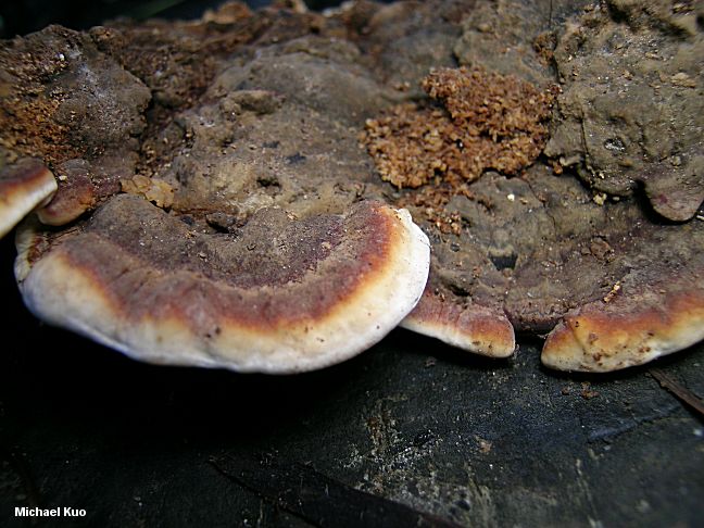 Heterobasidion annosum [ Basidiomycetes > Russulales > Bondarzewiaceae > Heterobasidion . . . ] by Michael Kuo This root and butt rot fungus is a destructive pathogen, appearing as a parasite on conifers across the continent. It is especially destructive in conifer plantations and in thinned second-growth conifer forests, and it is well known to foresters as "annosus rot." Given enough time, Heterobasidion annosum can kill a tree by rotting its roots and trunkwood, making it very susceptible to windthrow. Distinguishing features for Heterobasidion annosum include its irregular, rough, brown to black cap, which features a whitish margin and, often, a reddish marginal zone; its whitish pore surface, composed of tiny (4-5 per mm) pores; its whitish flesh, which does not turn black or red with KOH; and microscopic features. The cap is sometimes absent, or present merely as a short extension above the pore surface. Fomitopsis pinicola can appear similar, but appears higher on the tree (or log) and usually has a more regularly shaped cap, as well as flesh that turns red in KOH. Fomes annosus, Fomitopsis annosa, and Polyporus annosus are synonyms. Description: Ecology: Parasitic on the wood of conifers (rarely on hardwoods) and saprobic on deadwood; causing a white pocket rot of the roots and butt; annual or perennial; growing alone or gregariously at the bases of trees; appearing year-round; widely distributed in North America but rare in the central Rocky Mountains. Fruiting Body: Variable: sometimes merely a spreading pore surface; sometimes with a folded-over edge of a cap; sometimes with a poorly to well developed cap. Cap: When present up to 25 cm across and 15 cm deep; shelf-like to kidney-shaped or irregular; finely velvety or bald; roughened and cracked; brown to dark brown or black, with a whitish margin and a reddish to reddish brown marginal zone; sometimes hosting moss or algae. Pore Surface: Creamy to pinkish, orangish, or yellowish; not bruising appreciably; with 4-5 circular to angular pores per mm; tube layers often indistinct, to 3 mm thick. Stem: Absent. Flesh: White; corky to woody. Odor: Not distinctive. Chemical Reactions: KOH negative on flesh. Spore Print: Presumably white. Microscopic Features: Spores 4.5-6.5 x 3.5-8 µ; smooth or very finely roughened; subglobose to ovoid; hyaline in KOH; inamyloid. Cystidia absent. Hyphal system dimitic; skeletal hyphae dextrinoid. REFERENCES: (Fries, 1821) Brefeld, 1888. (Overholts, 1953; Gilbertson & Ryvarden, 1986; Lincoff, 1992; Barron, 1999; Miller & Miller, 2006; Trudell & Ammirati, 2009.) This site contains no information about the edibility or toxicity of mushrooms. |