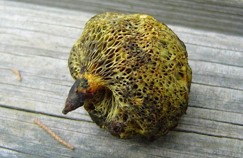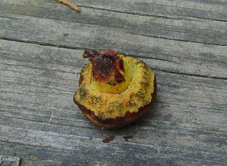 | Obviously, these are very mature specimens of Neoboletus pseudosulphureus. Less than 5cm wide. All parts stain/bruise blue when handled or cut. No reticulation (netting) on stem. Spores 10-14 x 4.5-6 µ; olive-brown in mass. Found mid-June. Boletus pseudosulphureus is a synonym. |
