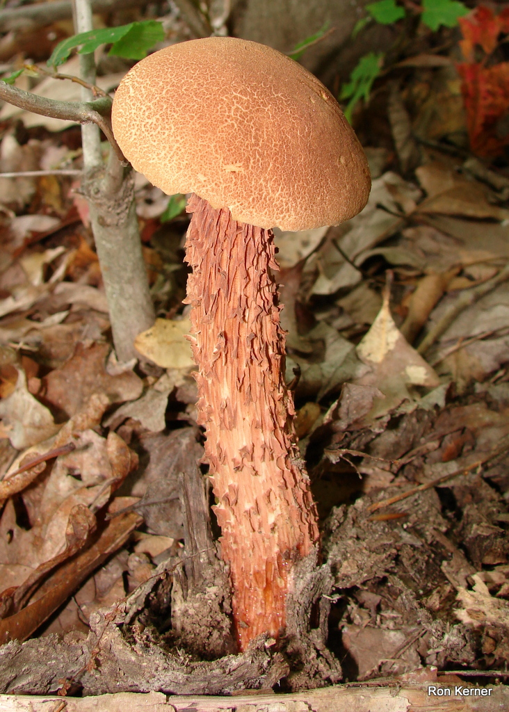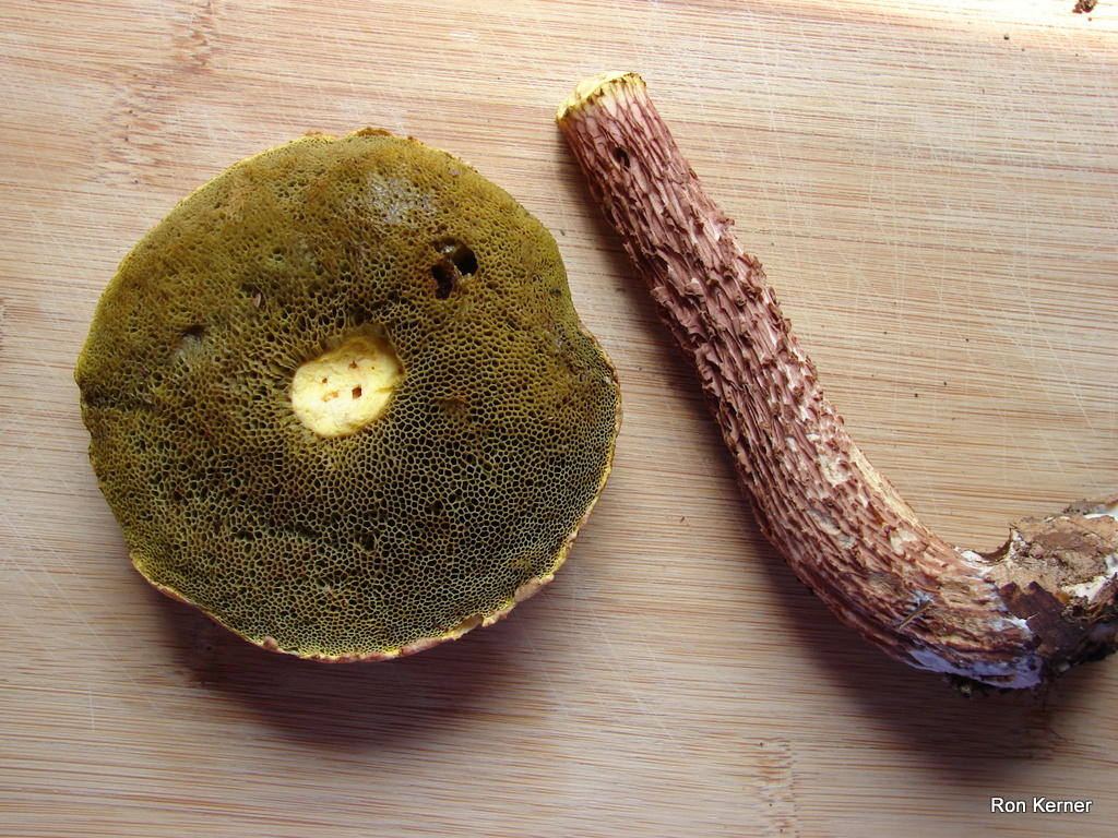 | These examples of Aureoboletus russellii were found in a mixed hardwood forest with oak and beech being the dominant tree species. Note the red/brown reticulation (netting) on the stem; dry, finely cracked cap; and yellow pore surface in young specimen and yellow/green pore surface in older one. Olive/brown spore print. |