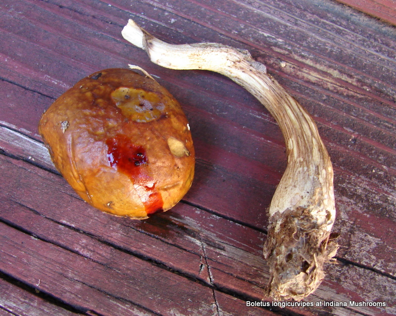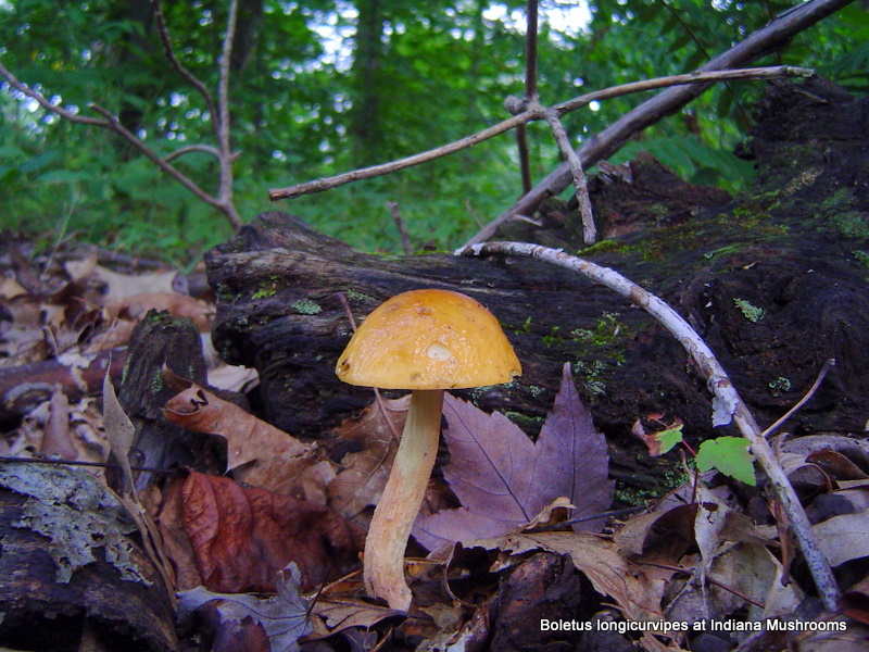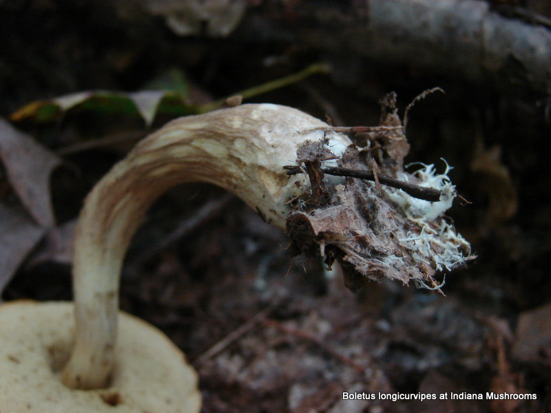 | Formerly Boletus longicurvipes. Found in summer and fall growing from ground in oak woods. Spore print dull olive to light brown. |
