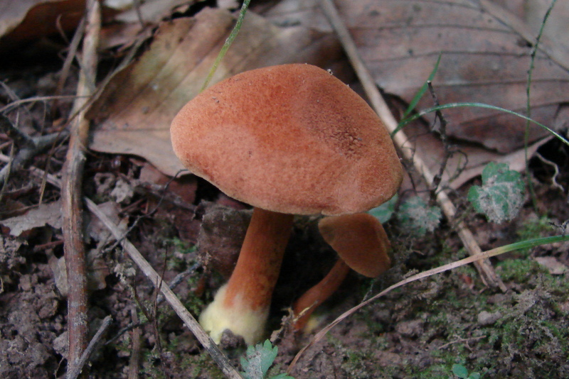 | Cap can be a deep reddish brown color and conical in shape as in this collection found along a trail in a hardwood forest. July. Bright yellow mycelium at stem base (did I need to tell you that?). |