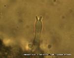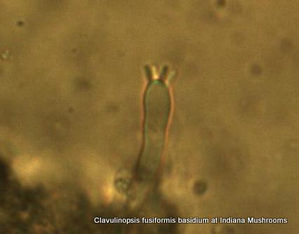 | This microscopic cell, a basidium, produces spores. These cells cover the outer surface of Clavulinopsis fusiformis and send spores off into the wind. |