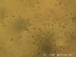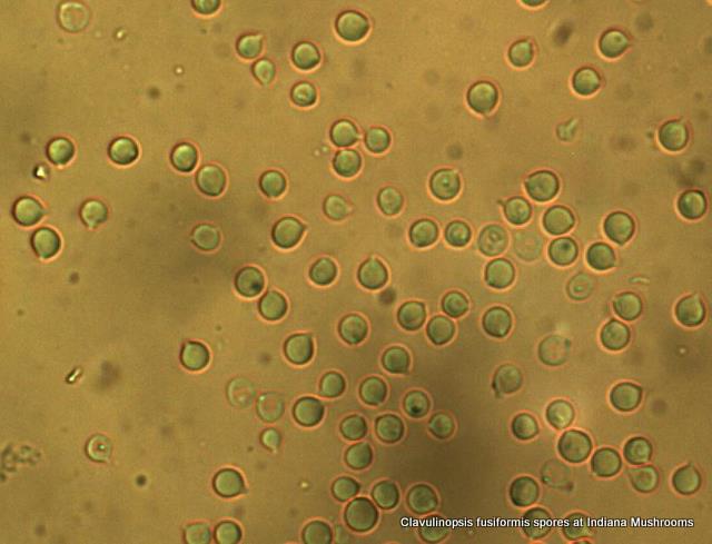 | The roundish spores of Clavulinopsis fusiformis show where they were once attached to a basidium. |