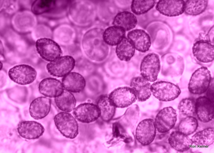 | The warty, almond-shaped spores of Cortinarius violaceus. |