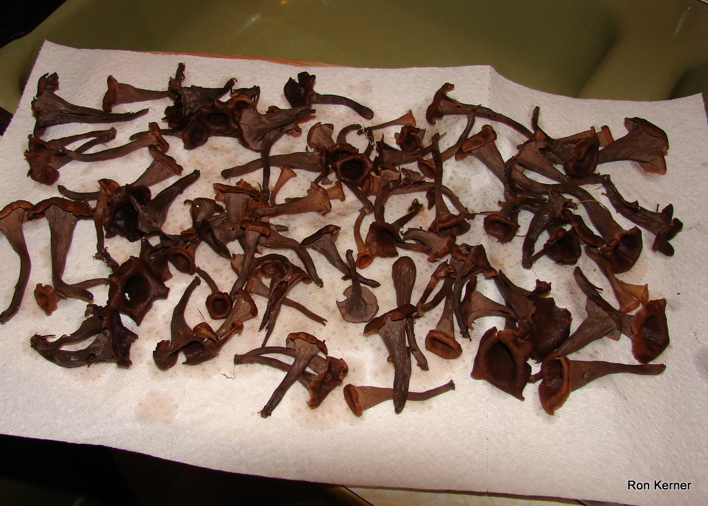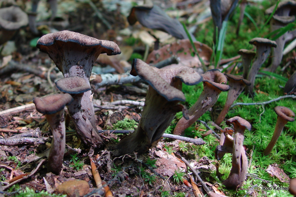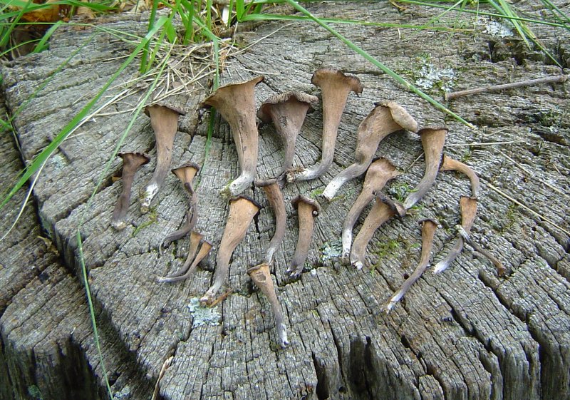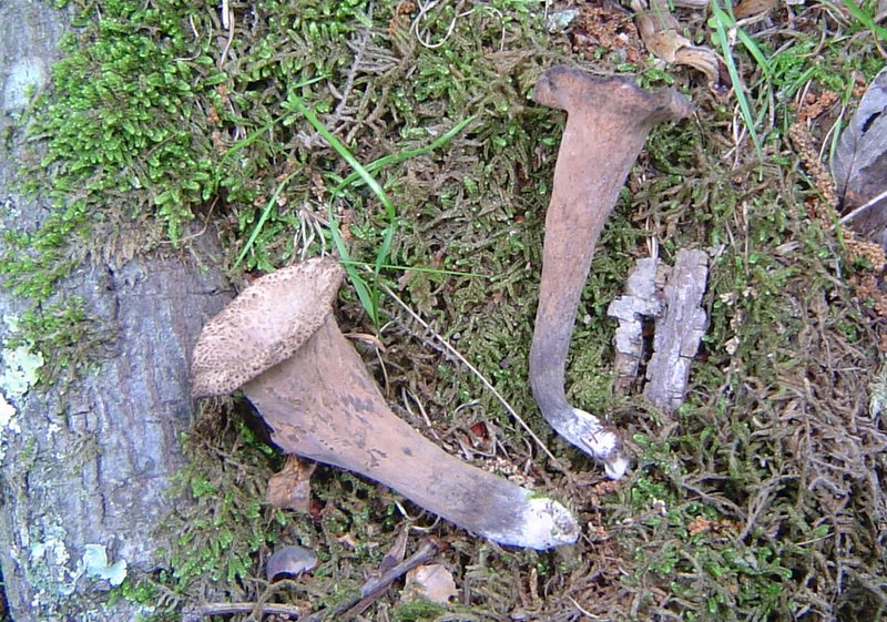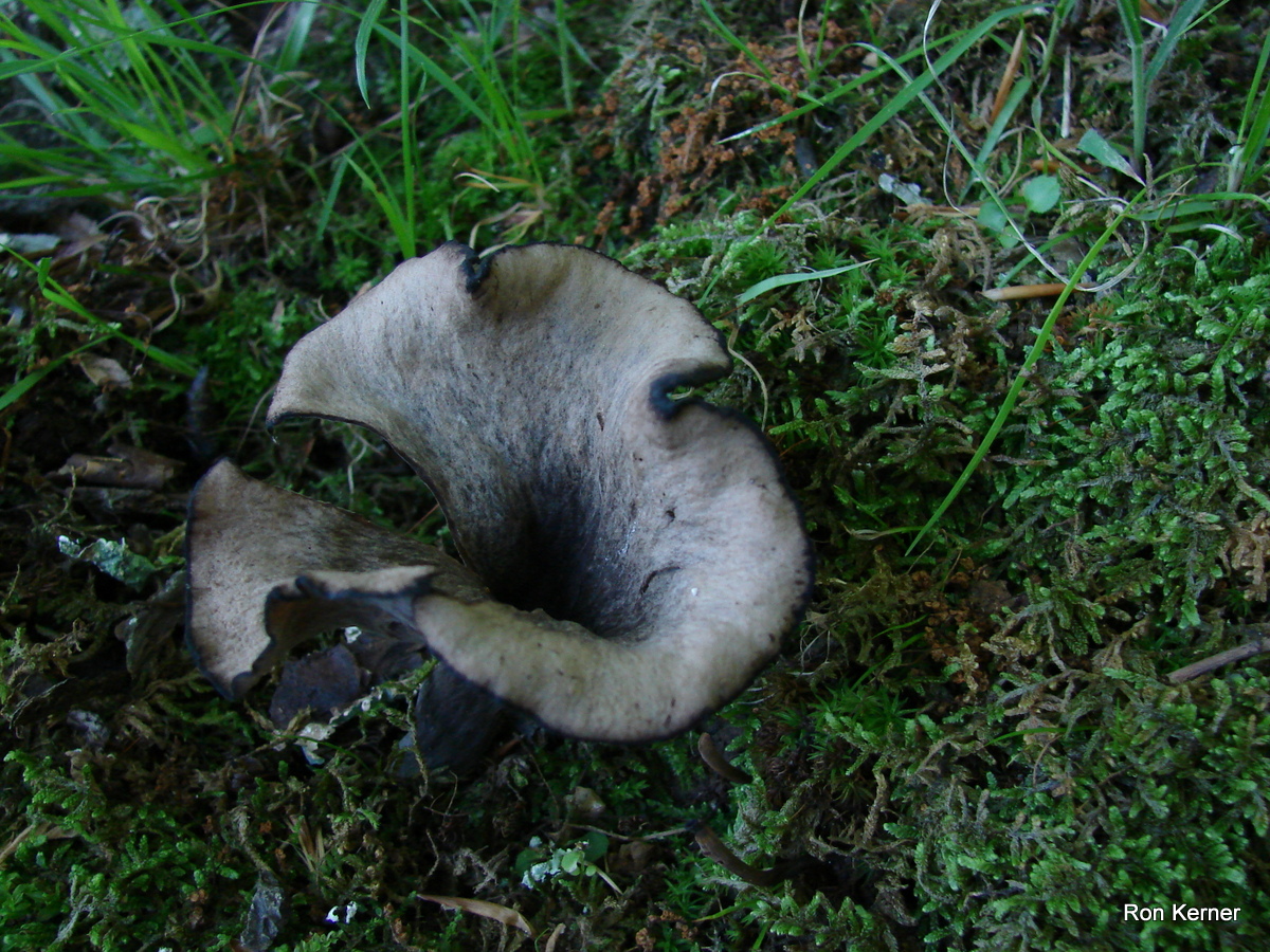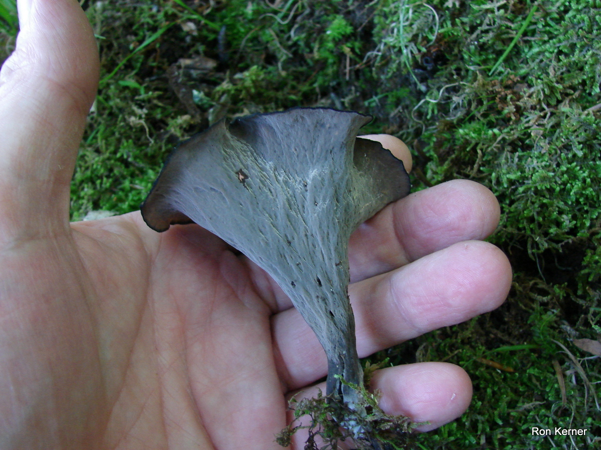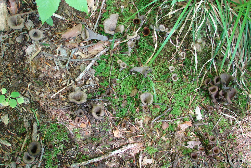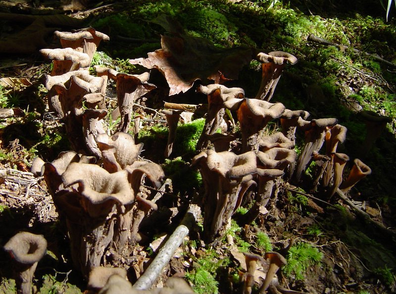 | Trumpet Mushroom, Horn of Plenty, Trumpet of Death are several common names. Color can vary greatly, from brown, tan, gray and black. Pinkish to orangish spore print. Often found along trails in hardwood forests. Excellent edible if you can find a mess. Makes a great cream of mushroom soup. |