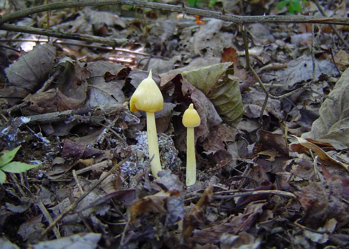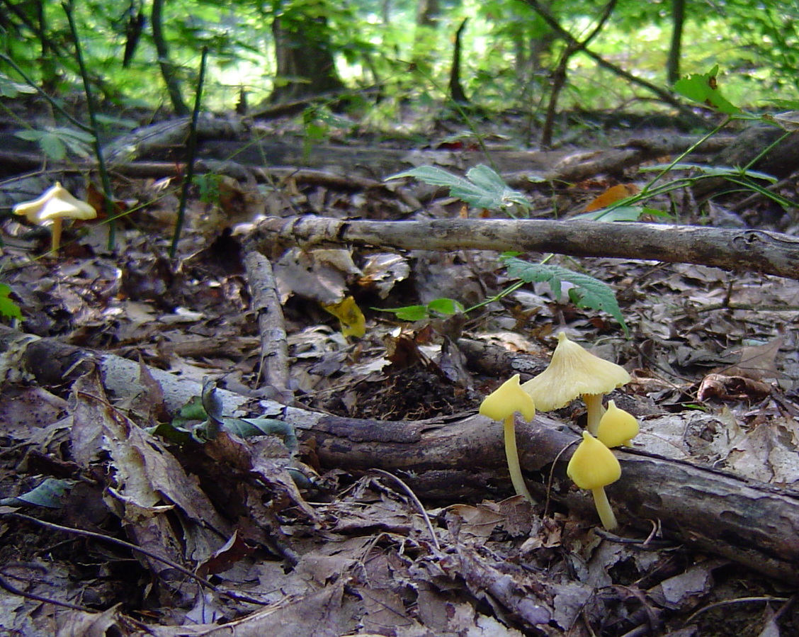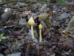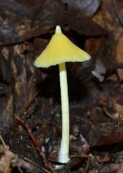 | The quirky Entoloma murrayi has a yellow cap, yellow stem and yellow gills. Its pointy cap gives rise to the common name yellow unicorn mushroom. |
