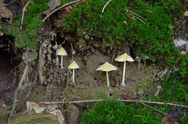 | Found in summer, damp conditions. Growing from leaf litter and soil, often with moss. Pink spore print. |