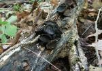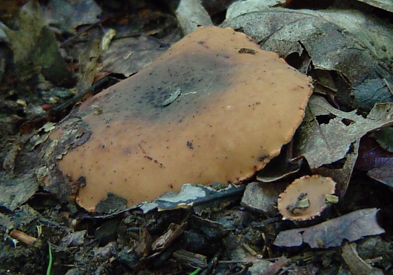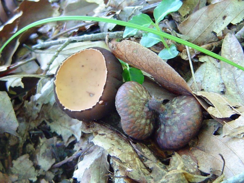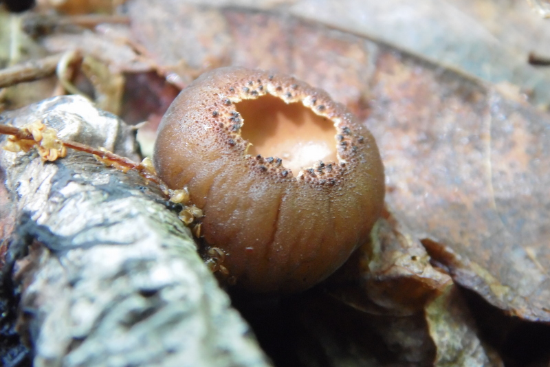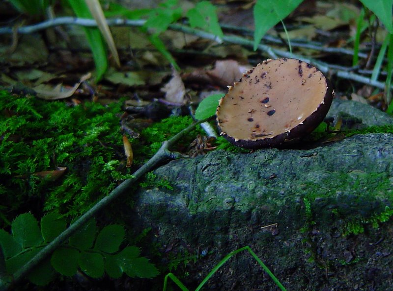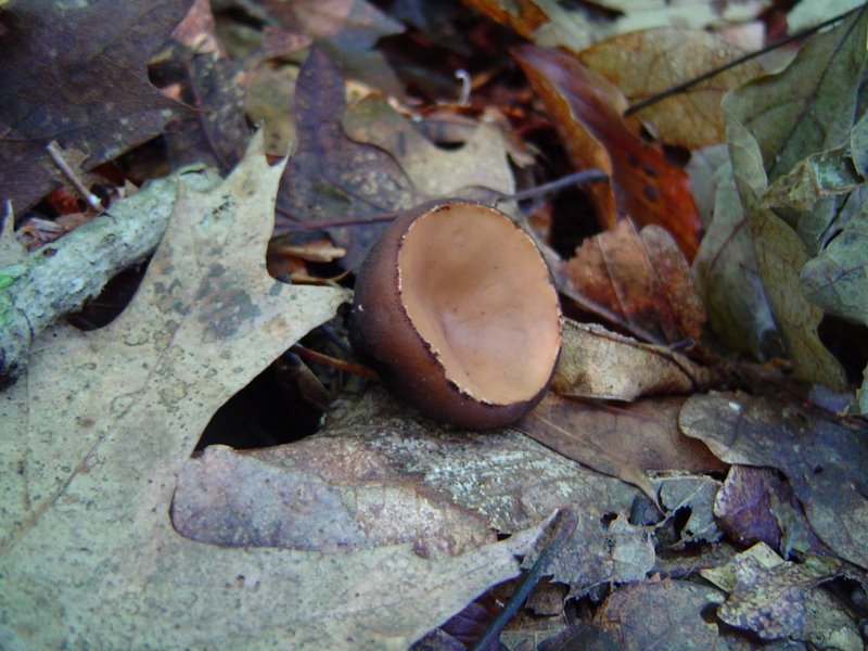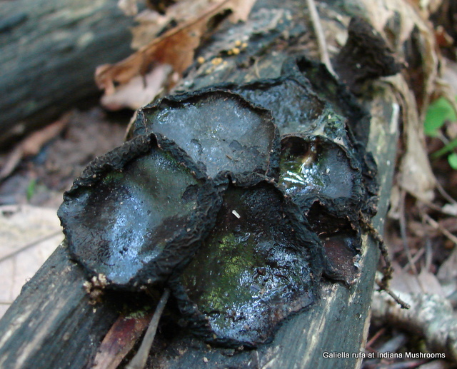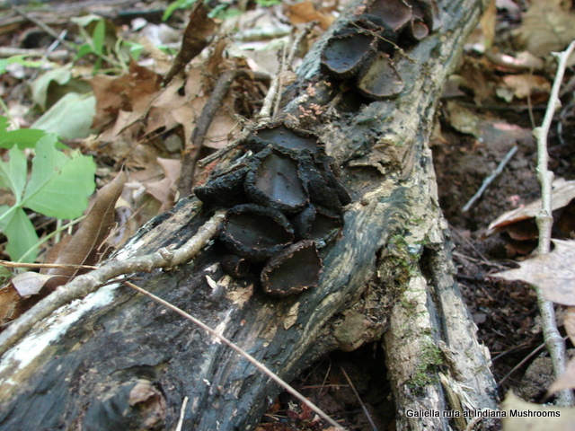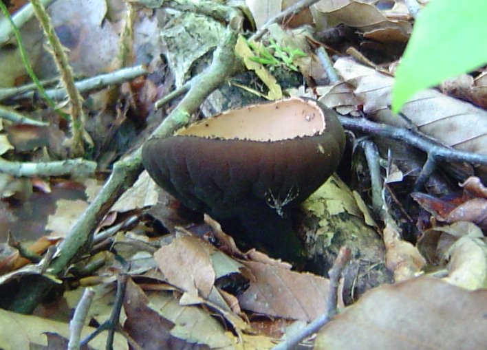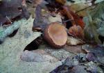 | This cup mushroom grows from sticks and small branches which are often partially buried. Rubbery consistency and the inner flesh is very gelatinous. Rubbing a finger over the inner cup will often produce a visable cloud of spores. |