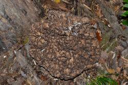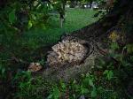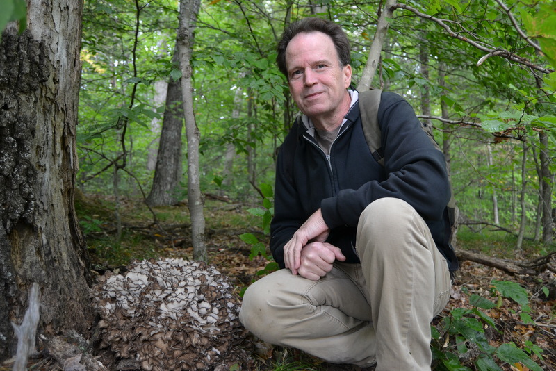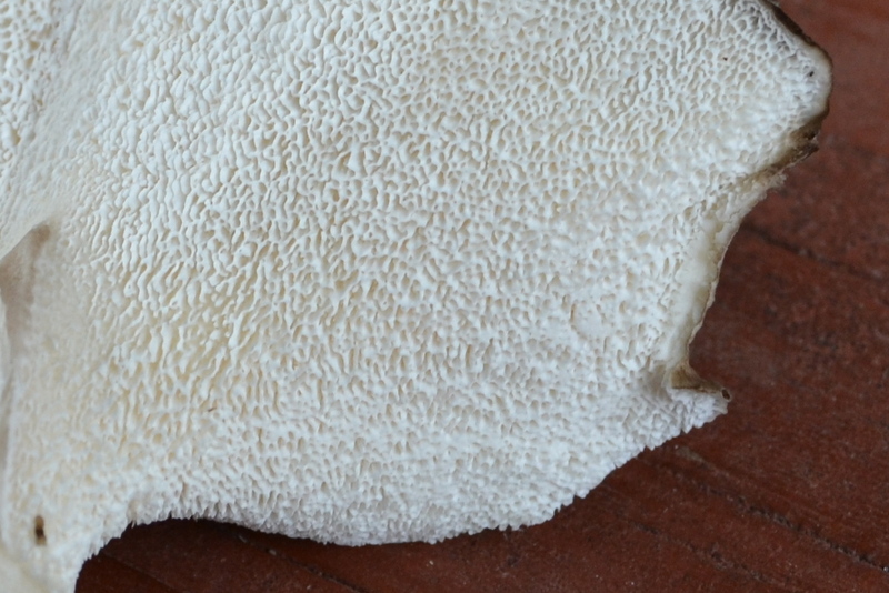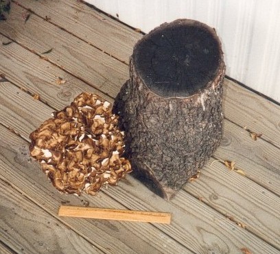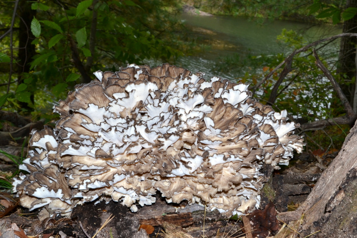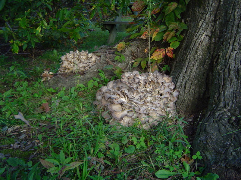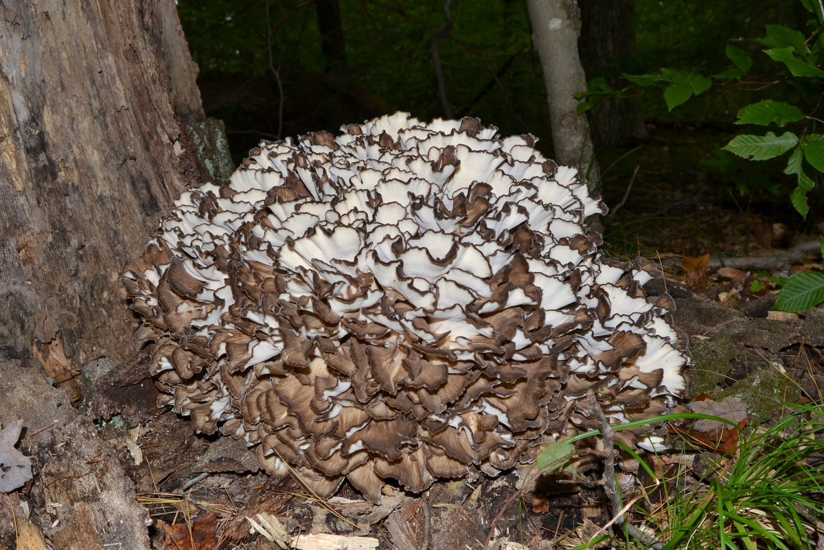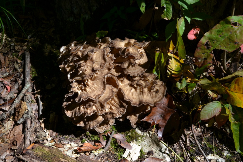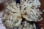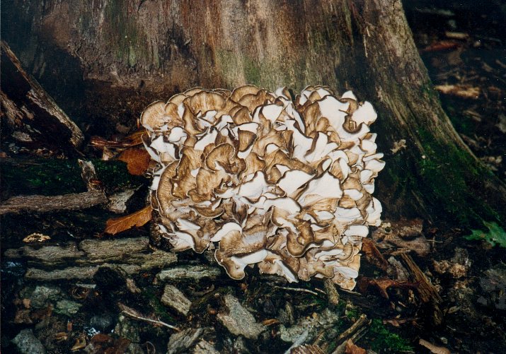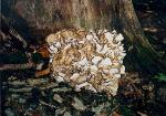 | This late summer and fall mushroom is most often found growing from base of oak trees. Also found beside other hardwoods and conifers. Common names include Hen of the Woods and Sheep's Head. The Japanese common name is maitake, which translates to "dancing mushroom". An edible mushroom sought out by many, Grifola frondosa has brown to grayish "fronds" that form from a branching structure. Pore surface is white and does not bruise black. Compare to Merripilus sumstinei. |