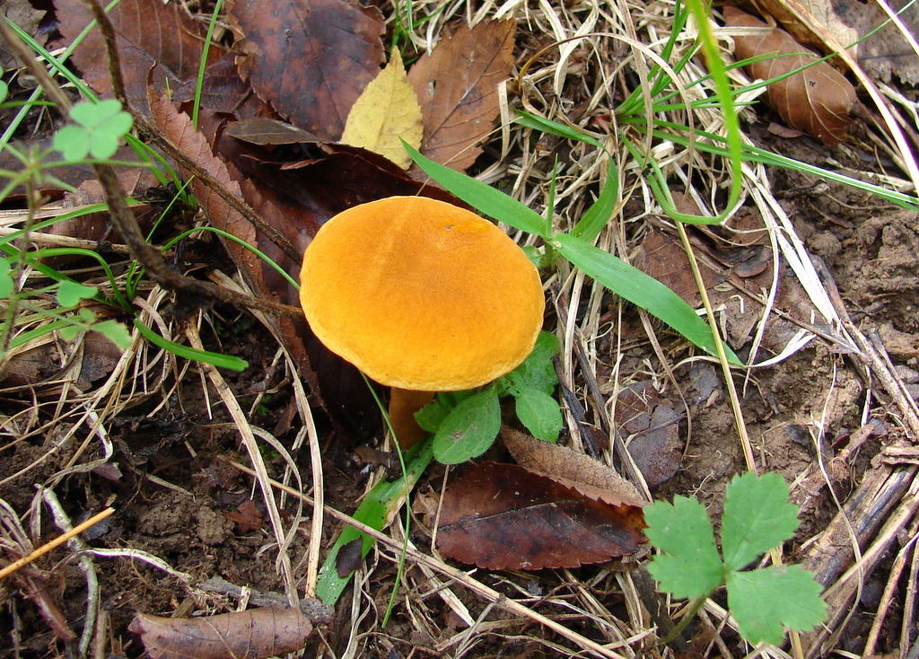 | This small bolete has an orange brown cap with a velvety feel. Pores are white and non-bruising; pores may become yellowish from the creamy yellow spores this mushroom produces. The stem breaks easily and becomes hollow with age. Found in hardwood forest and mixed woods, often in disturbed areas. |