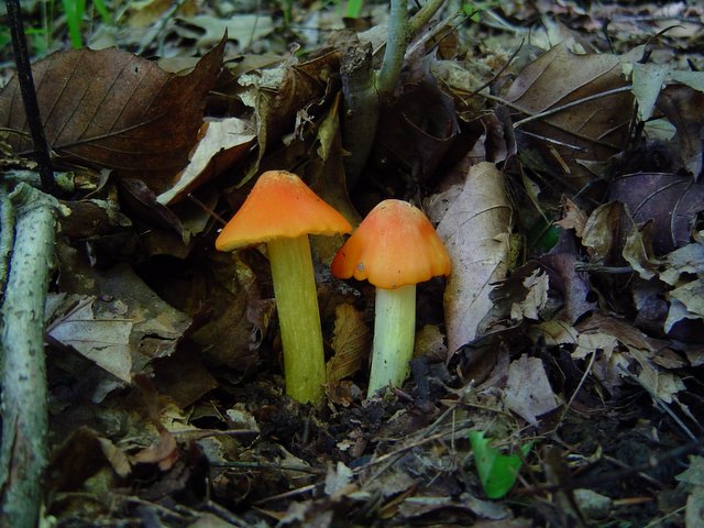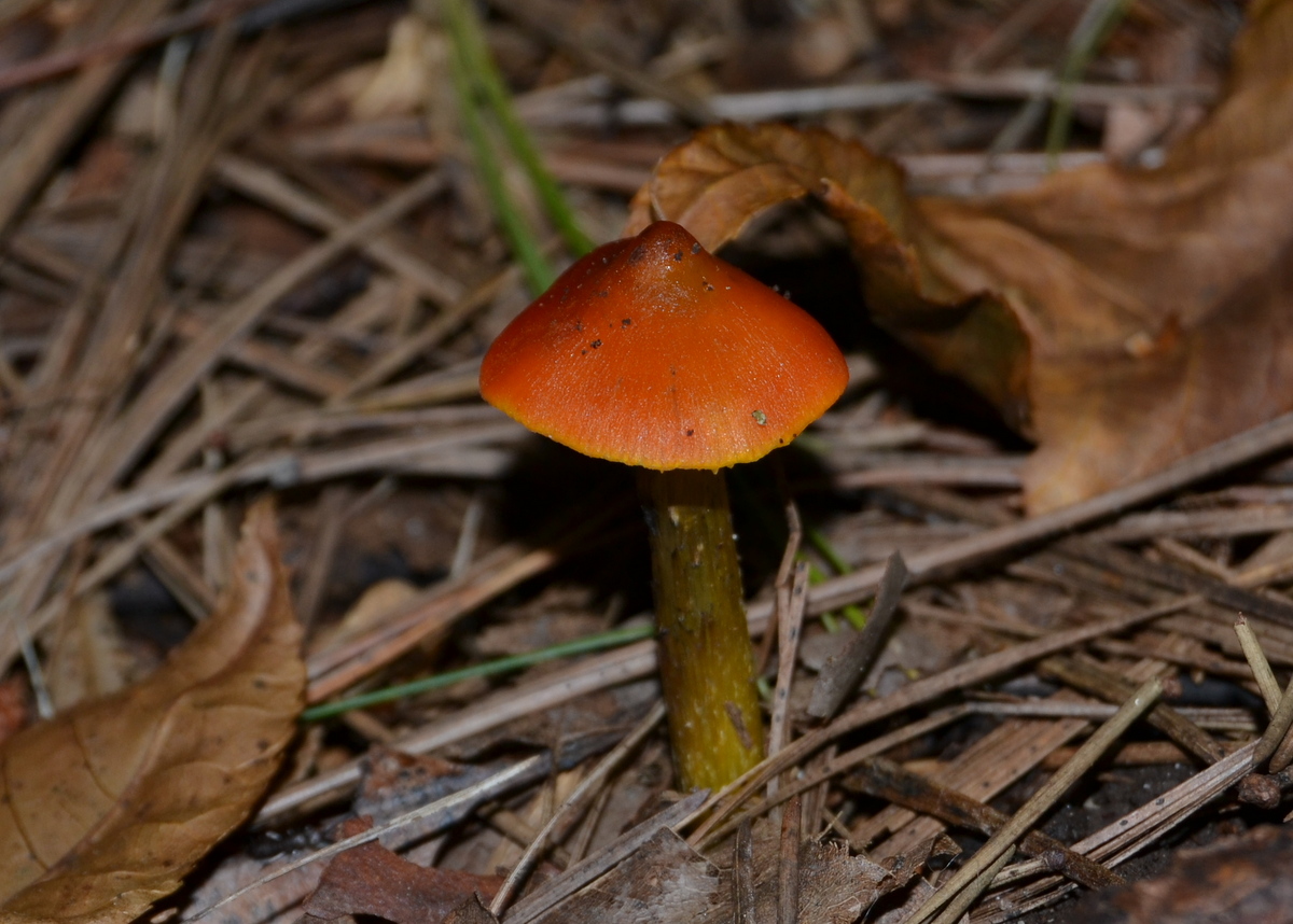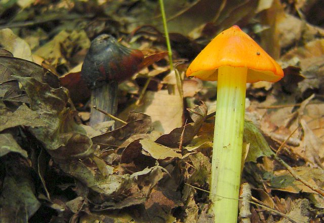 | All parts of this waxy cap mushroom stain black and the entire mushroom turns black with age. Common name: Witch's Hat. |