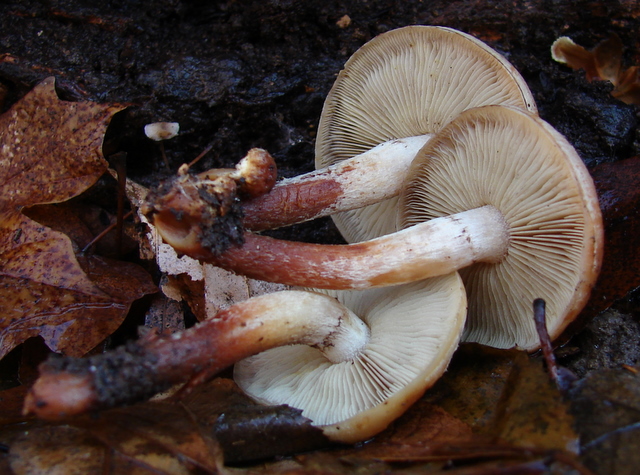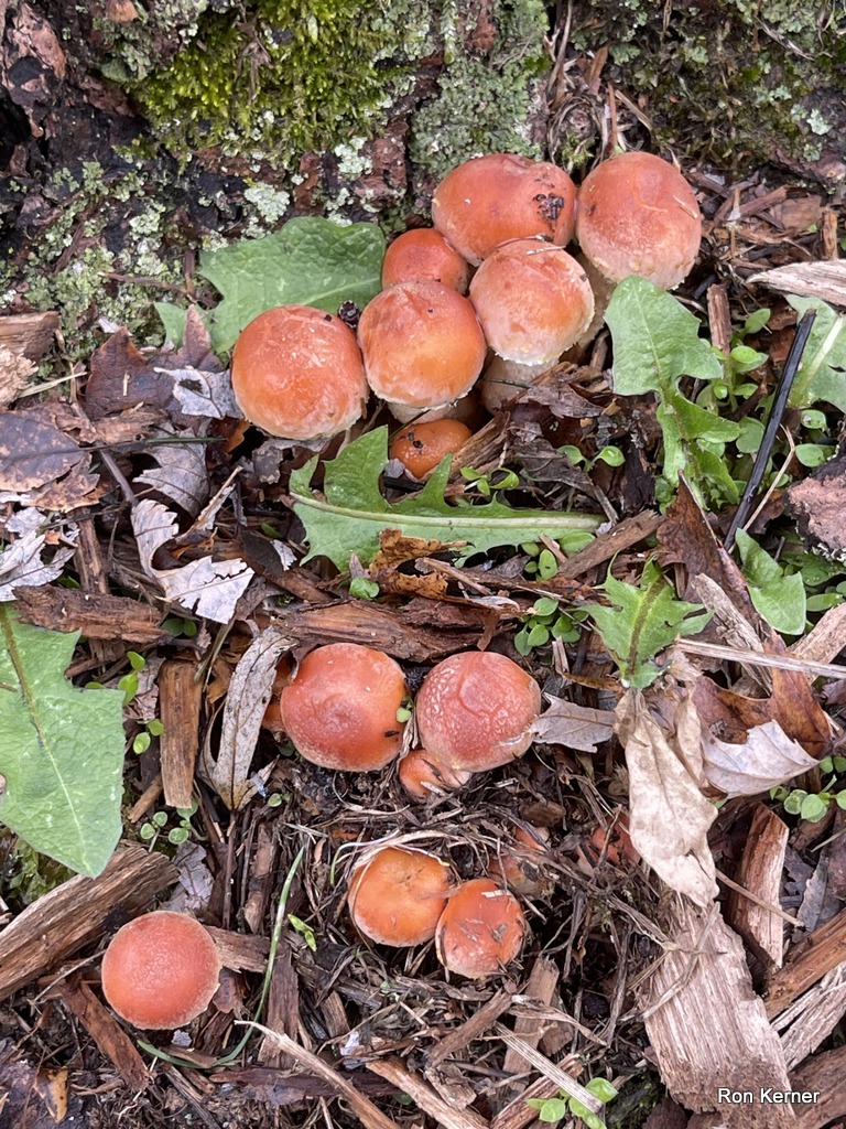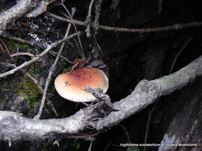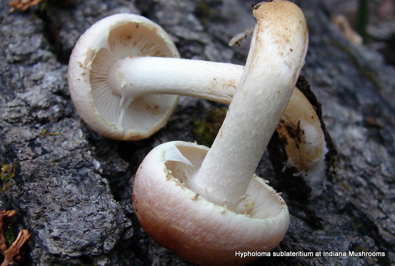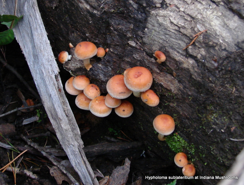 | Brick Tops. Found in fall. Cap color ranges from pink, orange and brick red, usually a combination of these. Partial veil remnants often remain on cap and cap margin, also leaves a ring on upper stem. Purple-brown spore print. Grows from wood. |