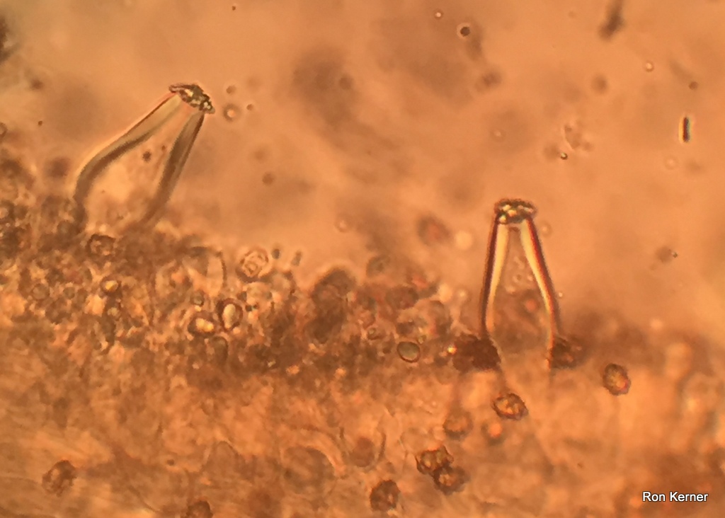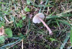| Brown cap (3cm) has white edges and the center is pruinose when young (finely frosted with white powdery granules); cap splitting with age with dark center. Stem equal; light brown, darkens when dried. Cystidia encrusted. June. County park under oak tree; moss present. Identified through DNA sequencing by Stephen Russell at Purdue University as a part of the North American Mycoflora Project. |