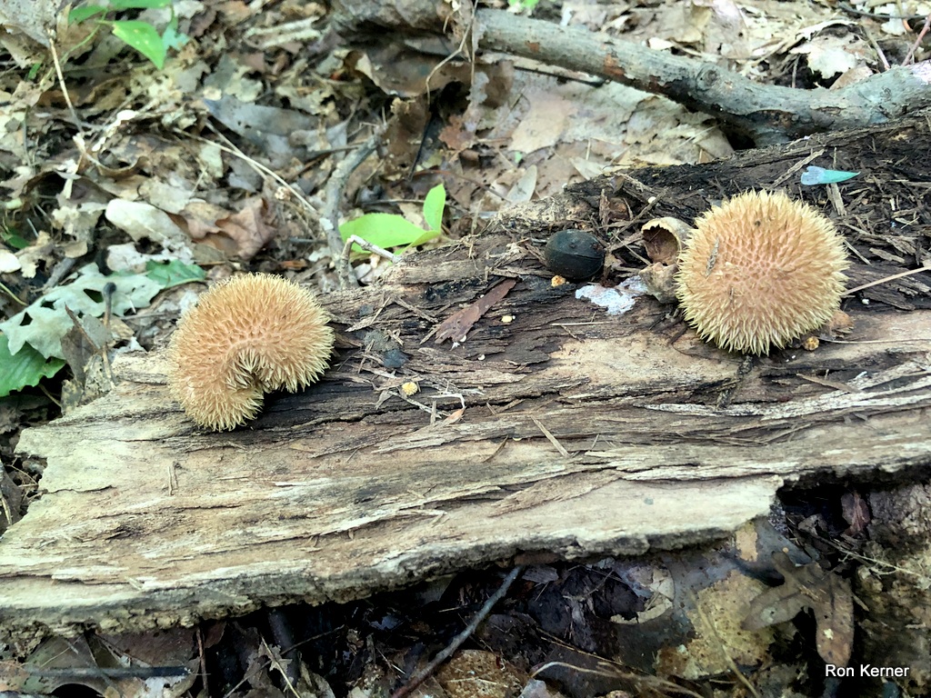 | A very young and an older, mature specimen. As this puffball develops, the spines fall off individually, revealing the coppery colored outer skin. Spores are released, often by rain drops, through a pore on top. |