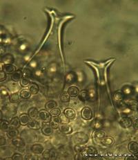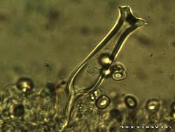 | Typical cystidia (microscopic cells on gill surface) of this unidentified Pluteus mushroom. |