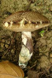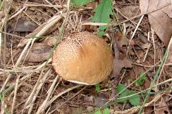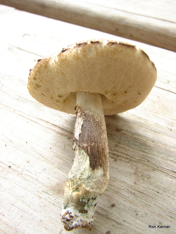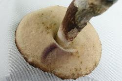| Found in hardwood forest (primarily oak) along a trail. The off-white pore surface bruised purple; and the stem of this specimen showed greenish coloration after being bug eaten. Spore print brown to reddish brown. |