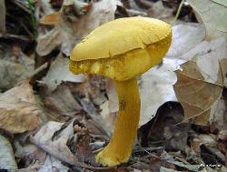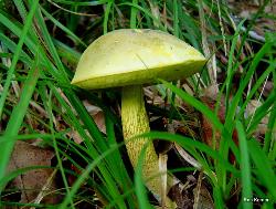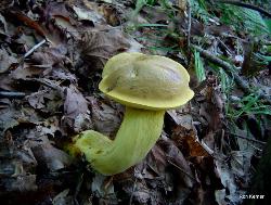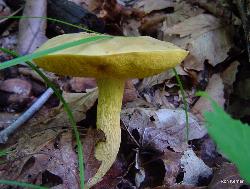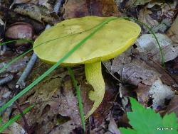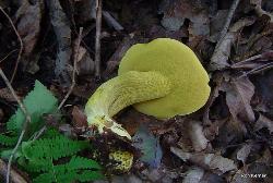 | This attractive bolete is associated with oak. Cap color can vary from a bright yellow to dull gray, gray/green or olive/brown. Stem highly reticulated (netted), especially when young. No staining or bruising when cut or handled, or, sometimes, slightly brownish. Boletus ornatipes is a synonym. |