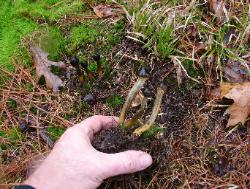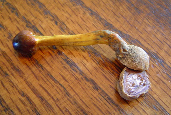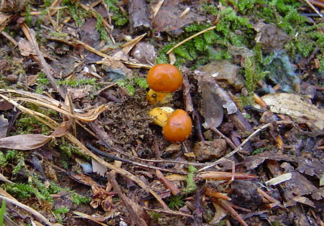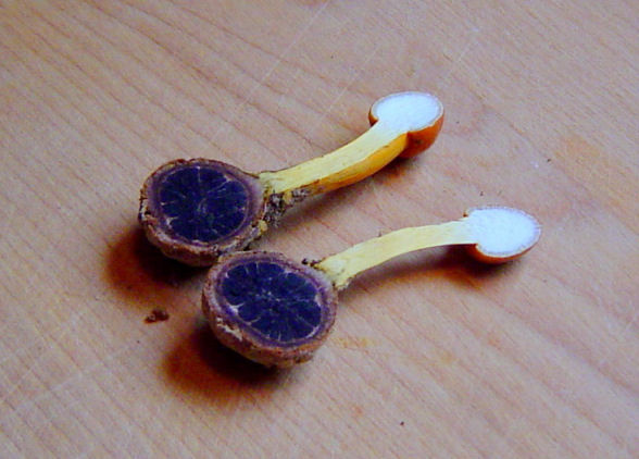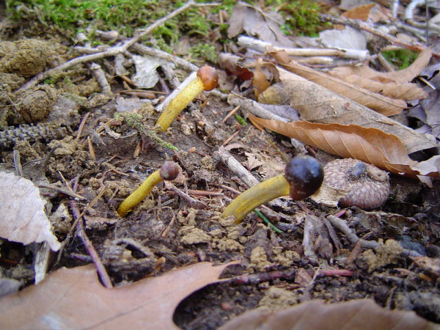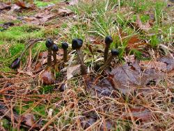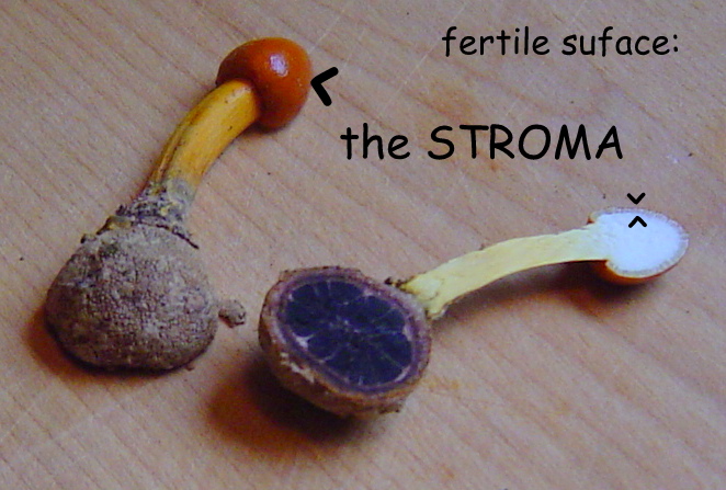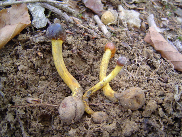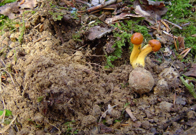 | These examples of Tolypocladium longisegmentum were very fresh (young) and the stoma and stem exhibited vibrant coloration. Growing from the underground fungus Elaphomyces granulatus. Without host, up to 5 cm long (2 in.) Compare to older and larger specimens pictured below. |