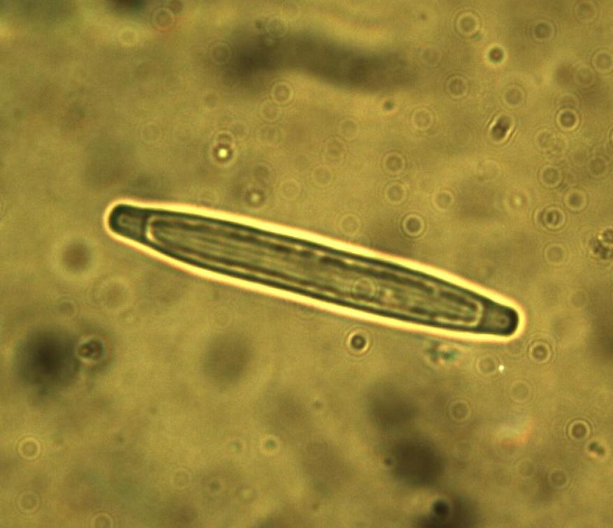 | The cylindrical partspores of Tolypocladium longisegmentum. Partspores measure 40-65 x 4-5 microns. (T. capitatum, a similar looking mushroom, has much smaller partspores, 8-30 x 2.5-3um.) |