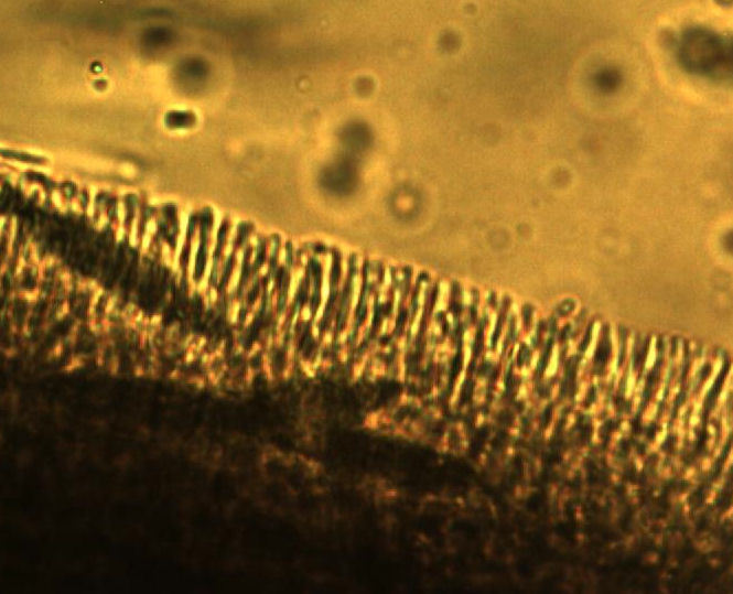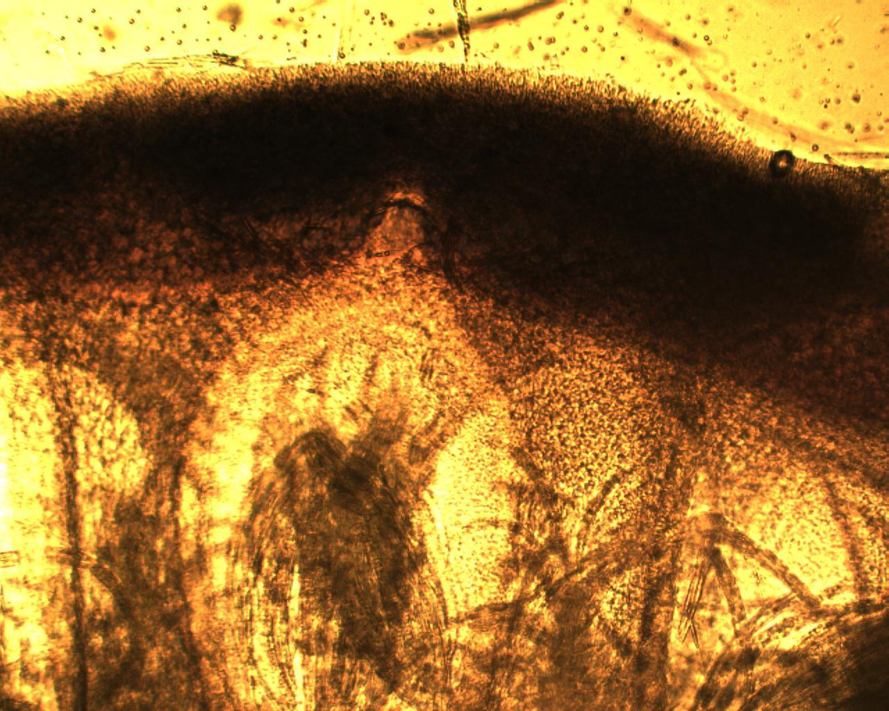 | Section of stroma epidermis (outer surface) of Tolypocladium longisegmentum. Note embedded flask or jug shaped perithecium (where asci are produced), and the palisade structure of epidermis. |