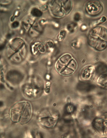 | This microscope image shows the cruciate (crossed) basidia of Tremella fuciformis. |