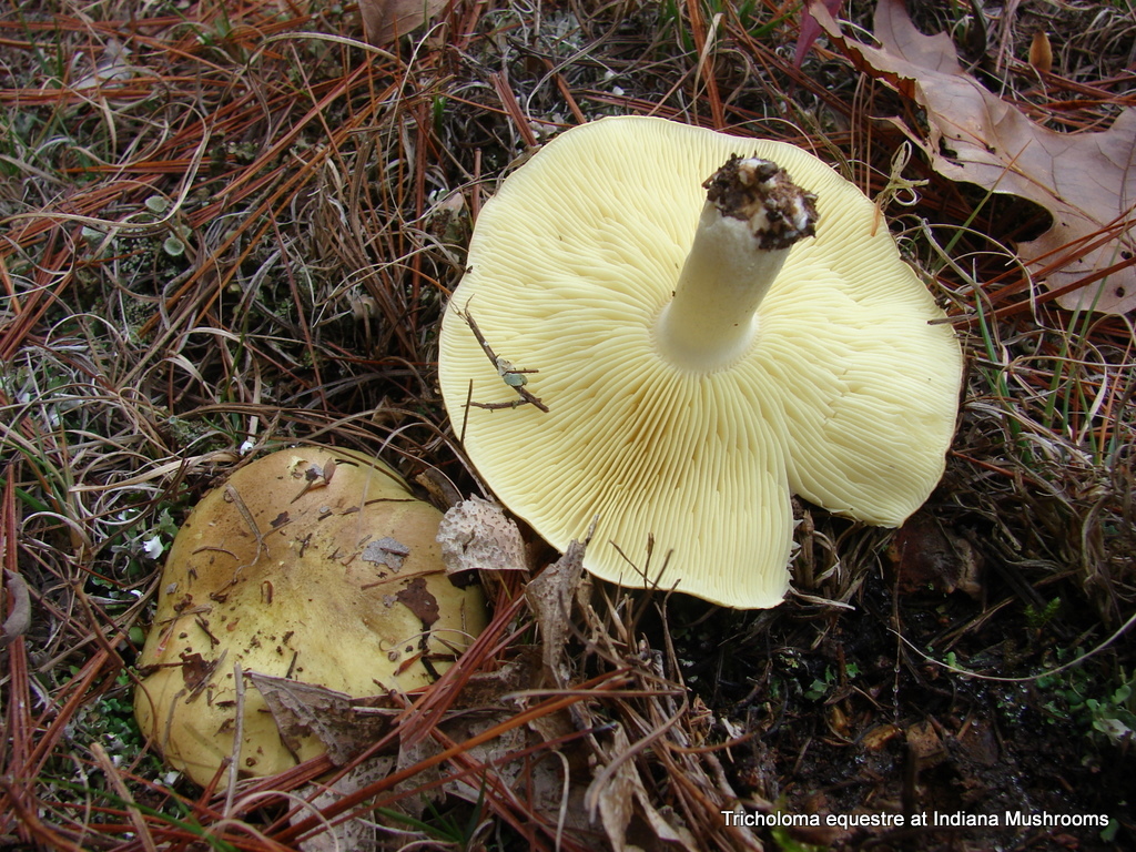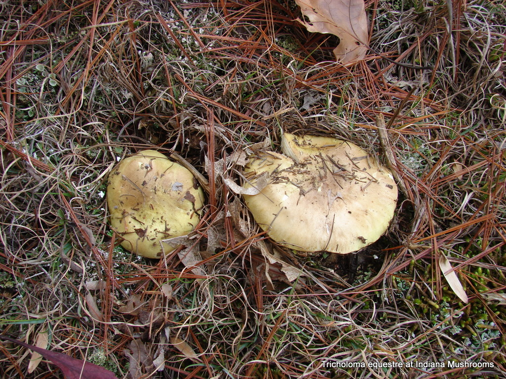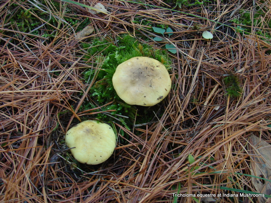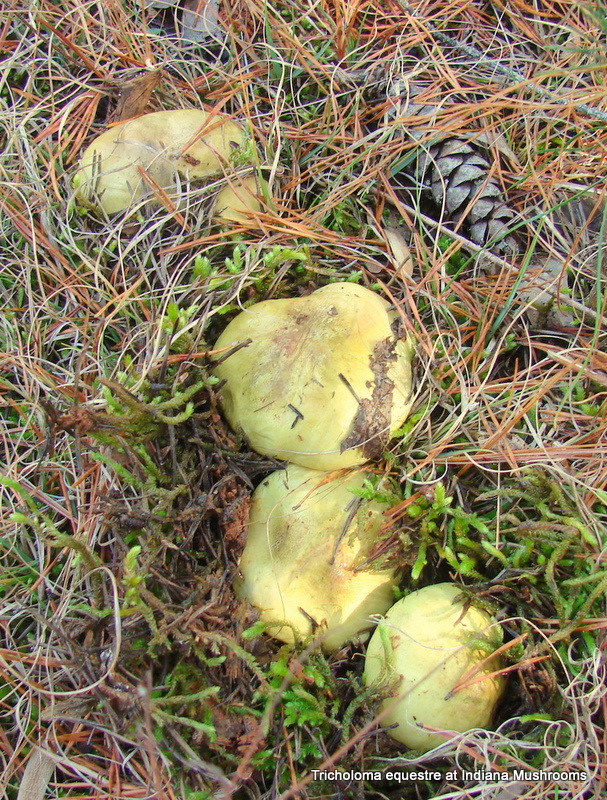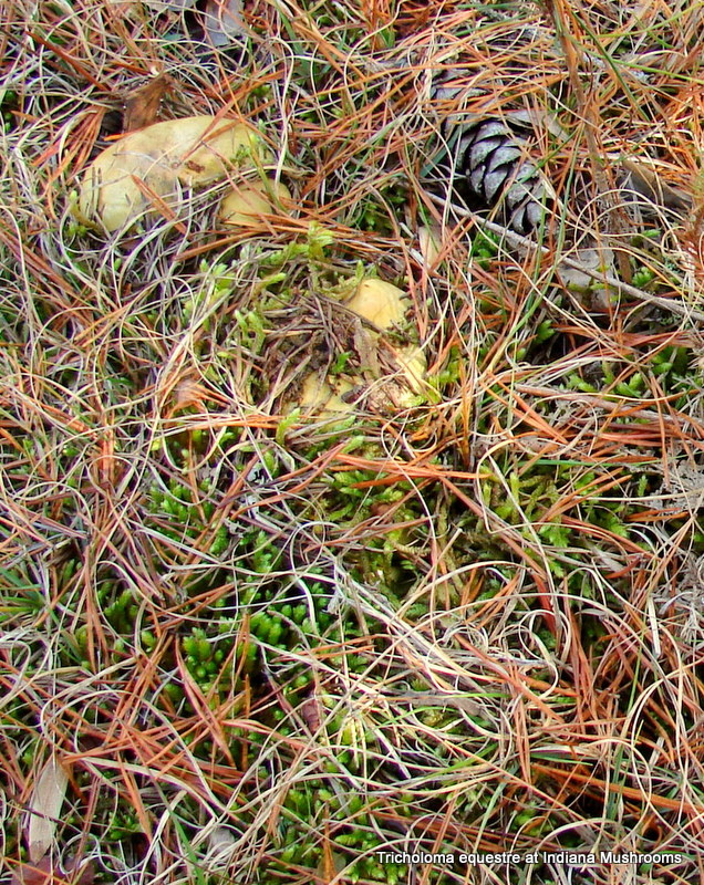 | Cap is typically yellow with a brownish center; average cap size is 2-5 inches but can be larger; big mushroom. Gills bright yellow. Stem white, often with yellow tones. These collections were found growing with Scots and white pine trees. |